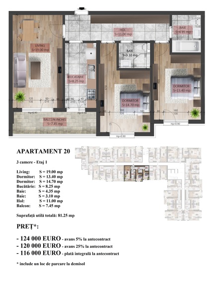 Optiuni interior: 2 grupuri sanitare Aer conditionat Apometre Balcon Centrala termica Contor gaze Inst. electrice noi Inst. sanitare noi Izolatie termica Termopan Usa metalica