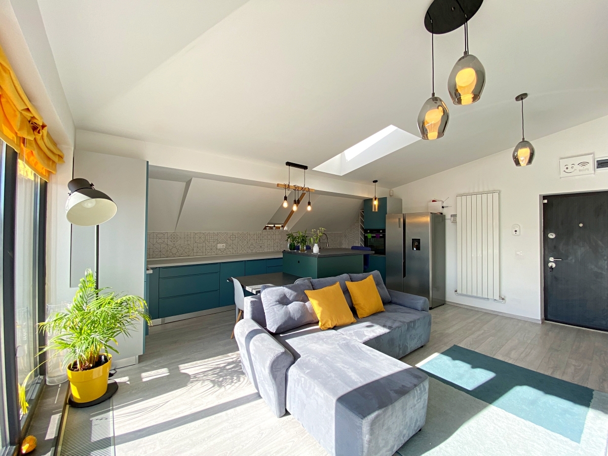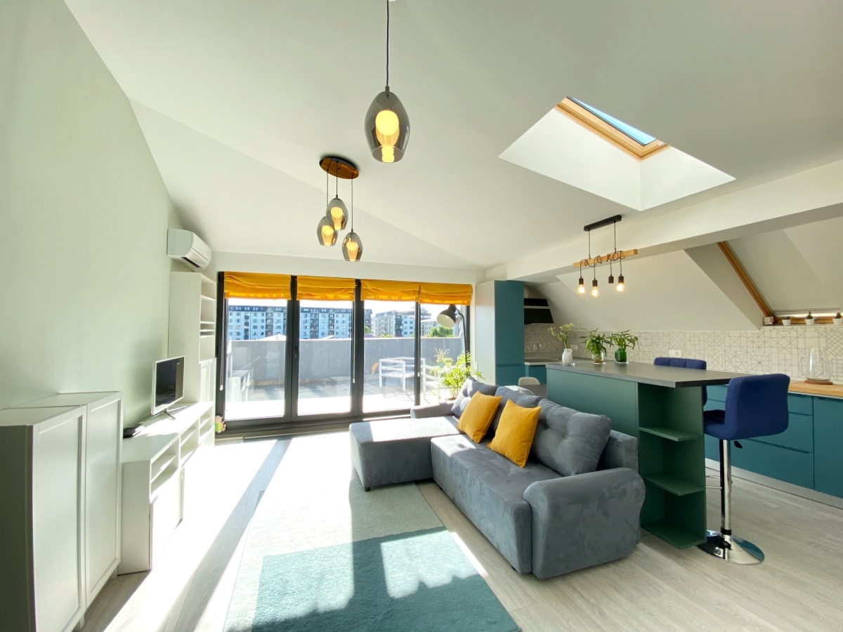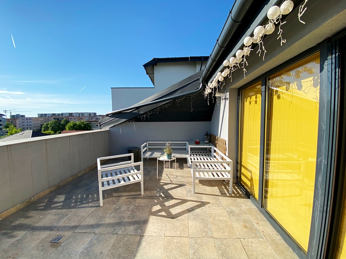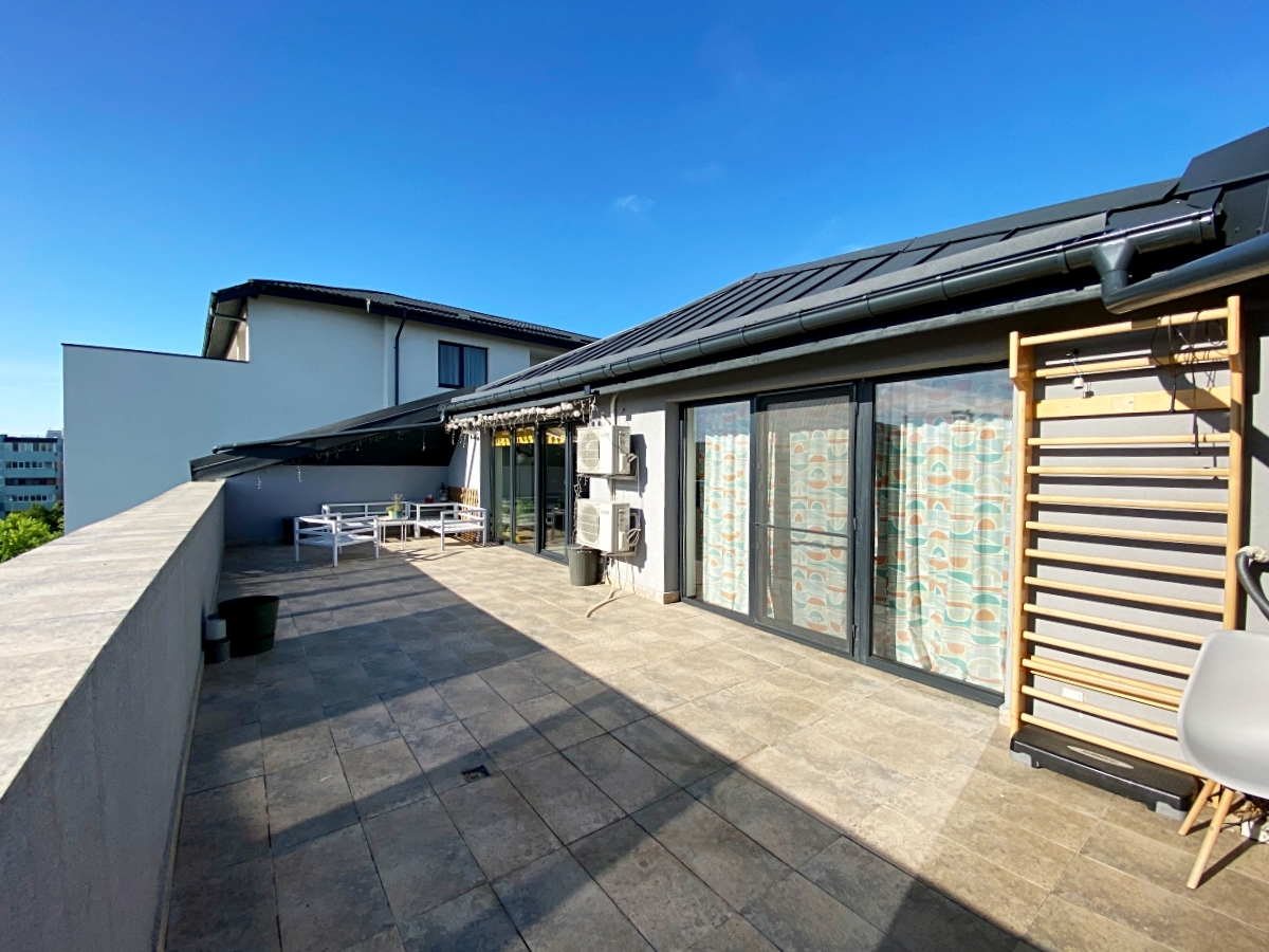 3 camere, penthouse, 2 bai, terasa 45mp, etaj 3/3 cu lift, zona verde si linistita, sistem degivrare terasa, se vinde complet mobilat si utilat, centrala proprie, utilitati individuale, 2 parcari