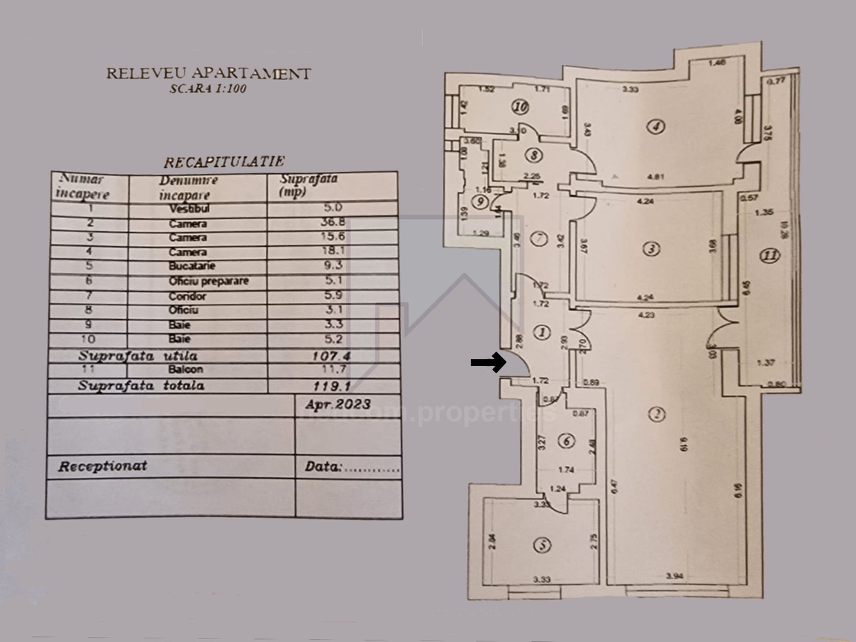 Se desfasoara pe suprafata de 108mp utili (119mp total), impartita in living, doua dormitoare, balcon cu acces atat la dormitor cat si la living, doua bai, bucatarie cu oficiu (in total peste 14mp), dependinte si holuri. Apartamentul vine insotit si de o boxa la subsolul blocului de 9 mp.