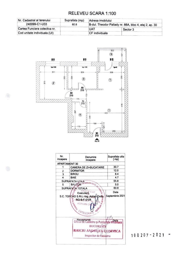 Apartamentul are o suprafata totala de 60.8 mp. Acesta este alcatuit din 1 camera de zi cu bucatarie, 2 dormitoare ,1 baie, 1 hol si 1 balcon. Apartamentul se preda la cheie, mobilat si utilat !