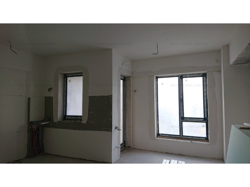 Structura, compartimentarile (zidaria), incalzirea in pardoseala, sapa, tencuiala, izolarea si decorativa la fatada, tamplaria termopan, instalatia de gaze, traseul pentru aer conditionat, scarile placate cu granit, instalatiile electrice si sanitare au fost finalizate.