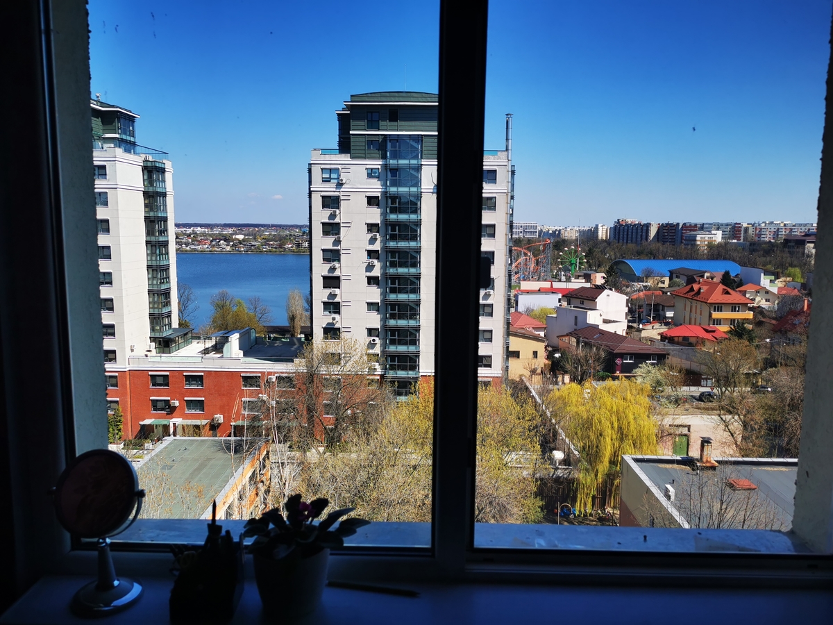 Apartamentul este situat la et. 9/10 si este compus din hol (7 mp) living, doua dormitoare, un grup sanitar, spatiu depozitare, balcon si bucatarie (bucatarie mare, 14 mp) Amplasarea geamurilor este pe doua laturi ale blocului, avand vizibilitate la strada de acces cat si la parc si lac.