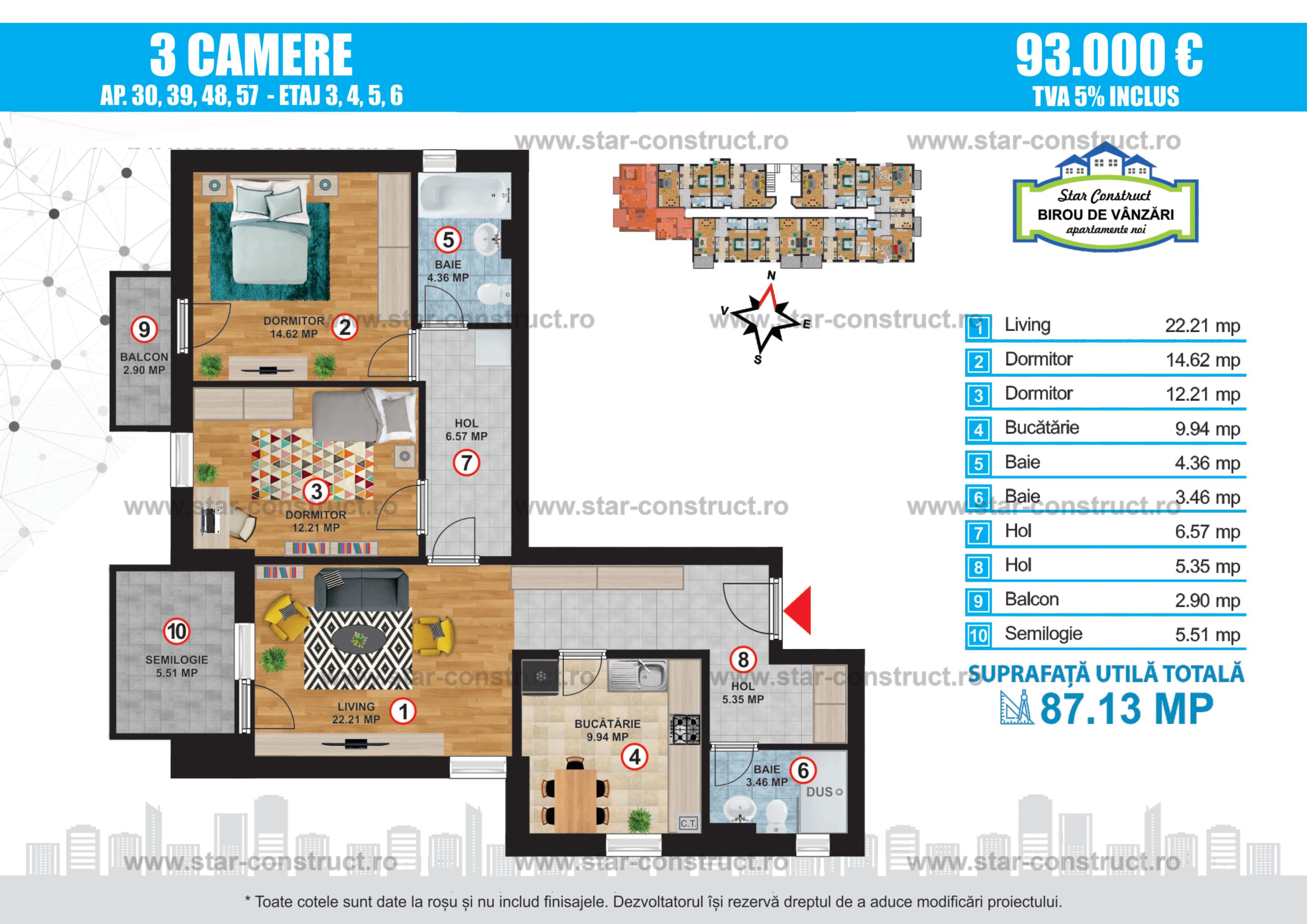 Apartamentul de 3 camere este alegerea perfecta pentru o familie moderna care isi doreste o casa frumoasa, compartimentata eficient, in care sa se relaxeze la sfarsitul unei zile de munca. Locuinta se vinde complet finisata si echipata cu centrala termica proprie in condensatie 24kw Immergas, calorifere verticale, obiecte sanitare pentru bai, tamplarie PVC cu geam termopan, usa intrare metalica antiefractie, gresie, faianta si parchet import Spania/Italia. Livingul apartamentului are 2 geamuri ce sporesc luminozitatea camerei, dormitoarele sunt spatioase, iar accesul pe balcoane se face din living si din dormitor.