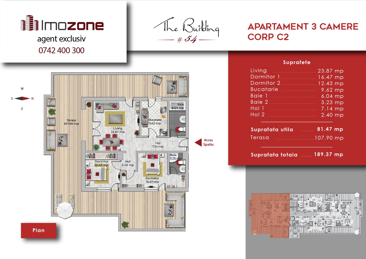 Apartamentul propus catre vanzare face parte din proiectul Lotus Residence - The Building 54, situat in Militari, Sector 6. Beneficiaza de toate utilitatile orasului (gaze naturale, energie electrica, apa si canalizare). Imobilul are regim de inaltime S+P+9E si contine un numar de 55 de unitati in primul corp. Cel de-al doilea corp are un regim de inaltime de S+P+3E+M si contine un numar de 35 de unitati , reprezentand apartamente cu 2 si 3 camere. Apartamentul despre care va vorbim este de 3 camere si este disponibil pe etajul 4, suprafata utila fiind de 81 mp si se afla in Corp 2.