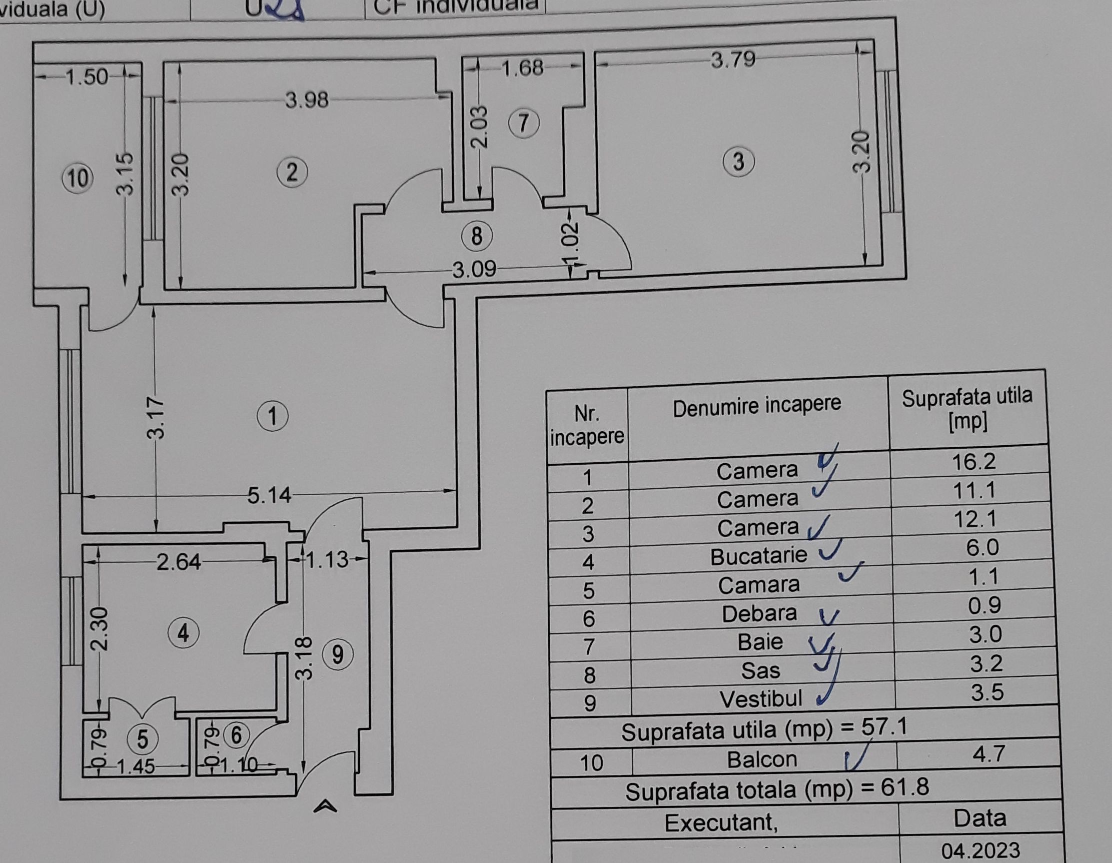 Vand un apartament cu 3 camere cu vedere dubla (fata si spate) in zona linistita si cu mult spatiu verde, suprafata utila = 57,1 mp si balcon = 4.7 mp. Blocul a fost izolat termic prin anvelopare. Intabulare, cadastru si certificat energetic la zi. Apartamentul este nelocuit si nemobilat.