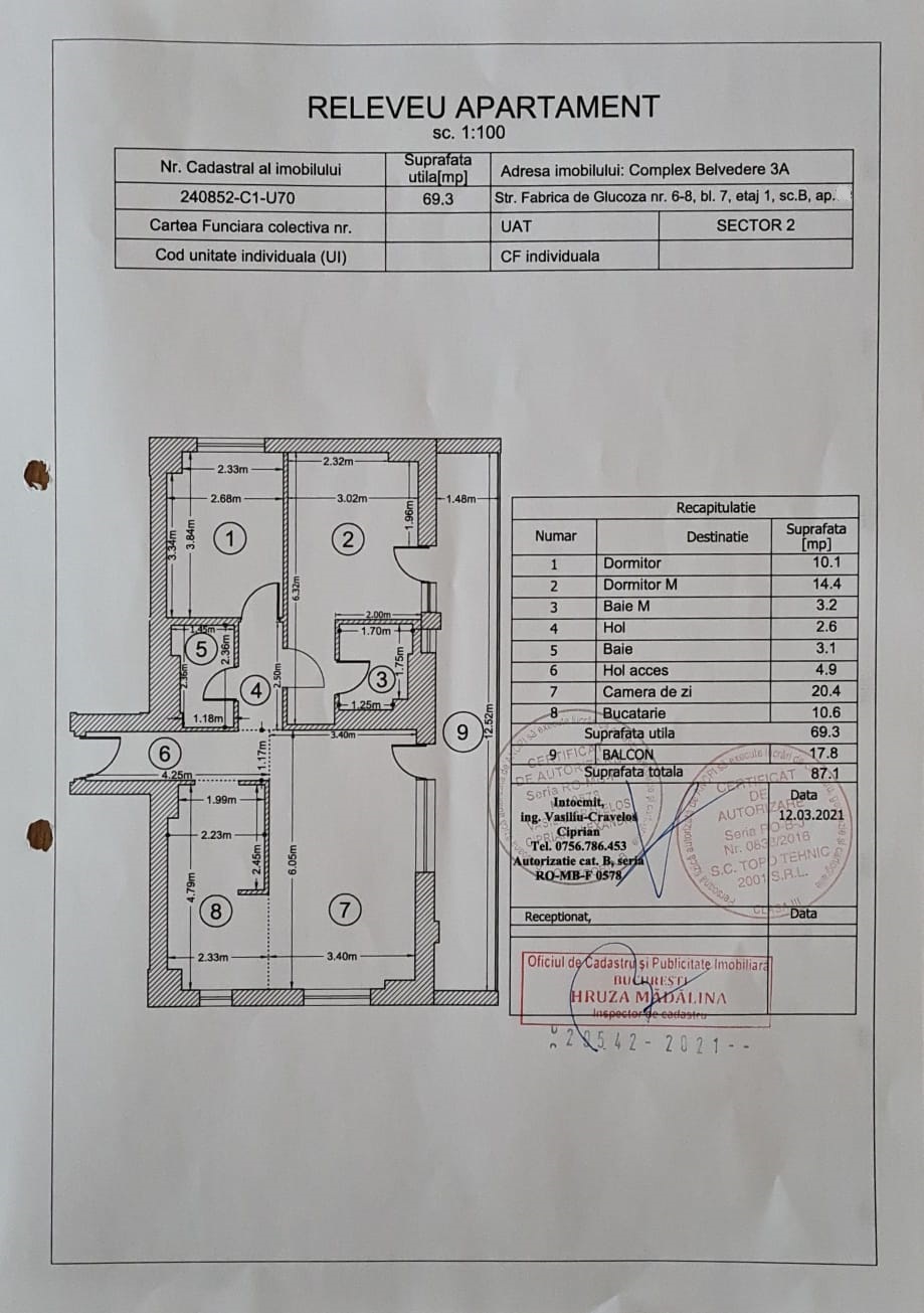 Societatea Violor Invest va propune la vanzare un apartament de 3 camere, in suprafata de 87 mp, situat la et 1 din 8, constructie 2021, in complex Belvedere situat pe Str Fabrica de Glucoza, cu vedere catre Sud, luminos, spatios, cu incalzire in pardoseala, cu terasa generoasa si loc de parcare subteran.