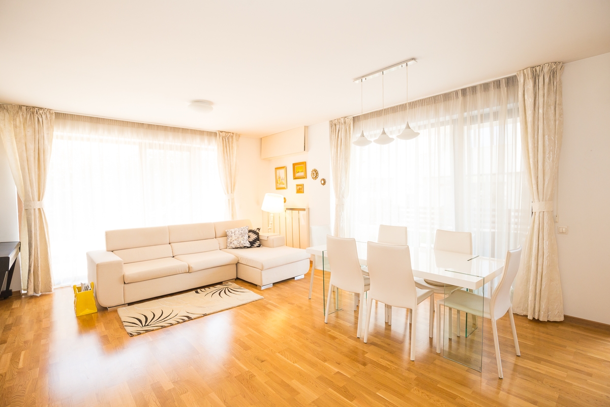 apartament modern cu 3 camere. Complet mobilat si utilat, 90 mp utili + 140 mp gradina. Acces rapid la Pipera Plaza, A3 si centrul orasului. Loc de parcare la subsol. Disponibil imediat. Comision 0%,