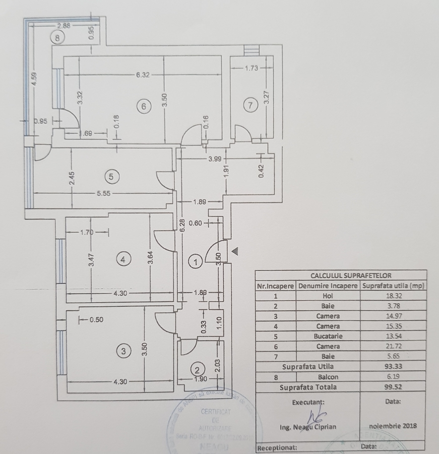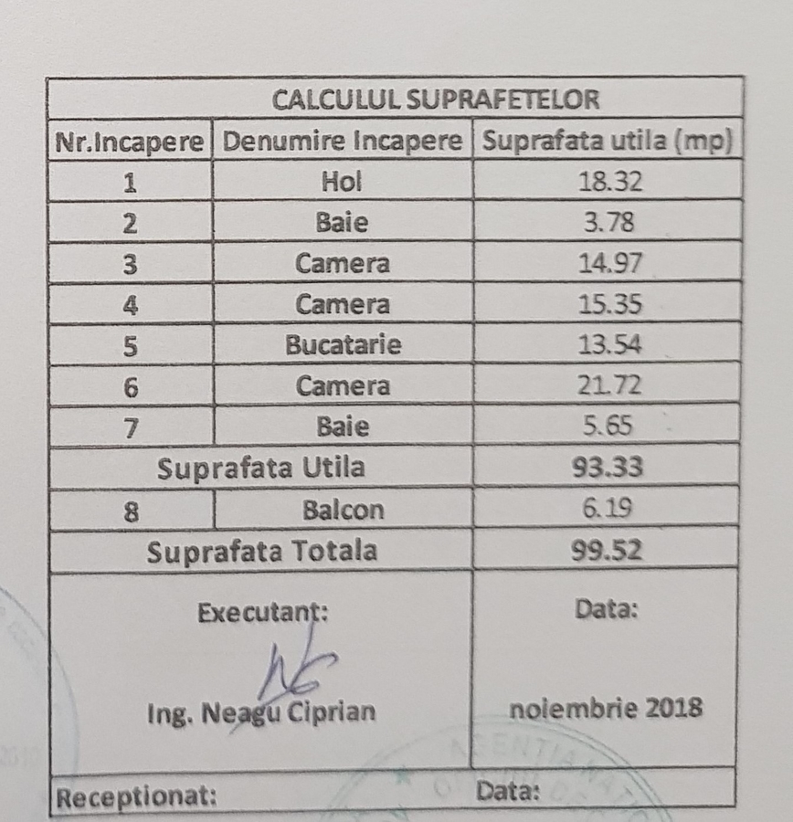 Apartamentul dispune de o suprafata de 93,33mp utili si SUPRAFATA TOTALA=99,52mp.Prezinta centrala proprie.