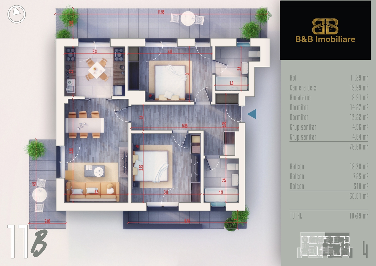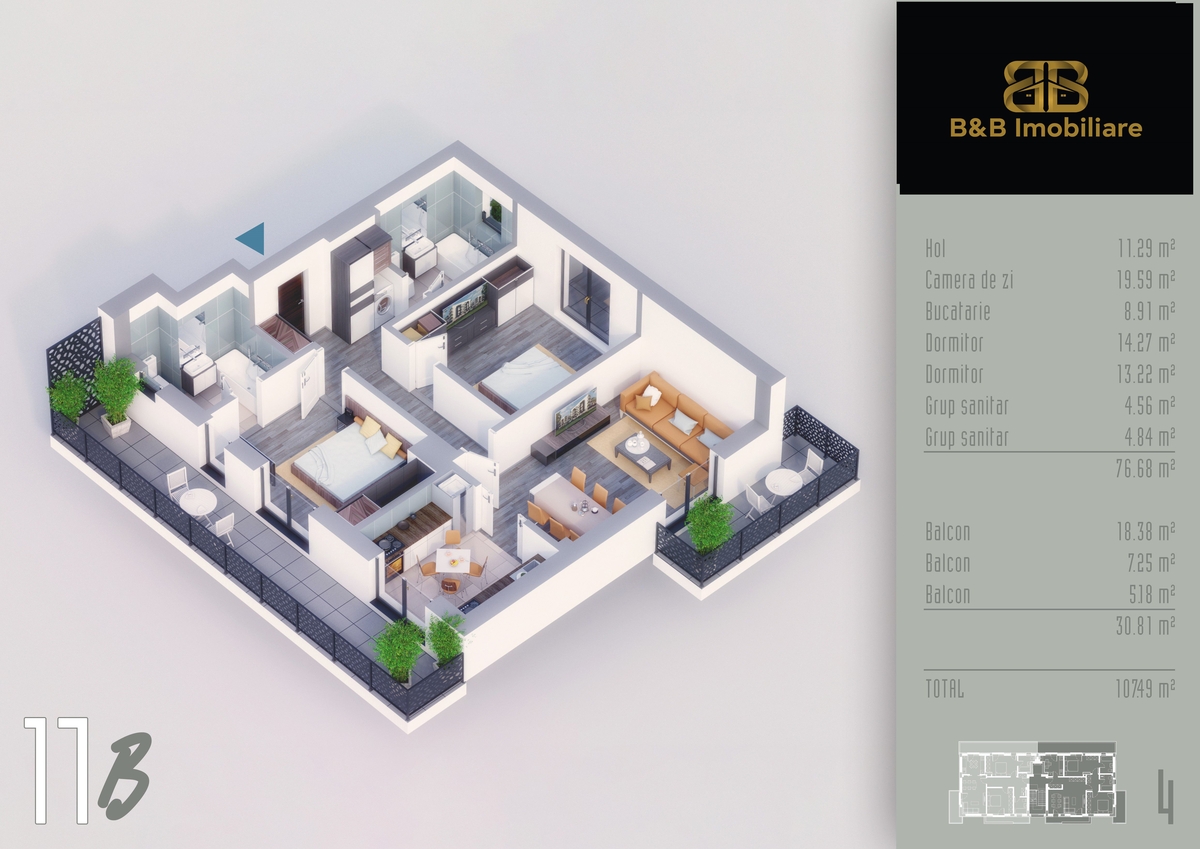 Apartamentul are o suprafata totala de 107.49 mp. Acesta este alcatuit din 1 camera de zi , 2 dormitoare ,1 bucatarie, ,2 baii, 1 hol si 3 balcoane cu acces din ambele dormitoare,living si bucatarie.