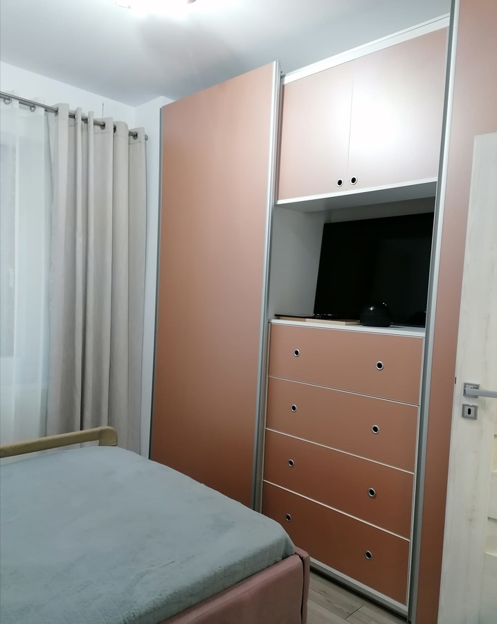 - Dressing-uri mari pe hol si in ambele dormitoare , facute pe comanda speciala , cu fronturi MDF , cu usi glisante si sertare cu amortizoare sistem Bloom