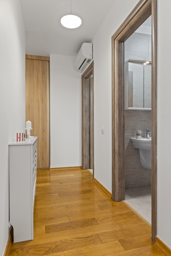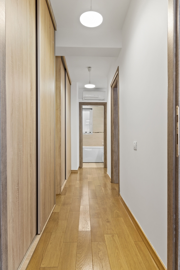 Holul lung are doua dresinguri incorporate in perete ce deserveste intrarea in cele doua dormitoare.