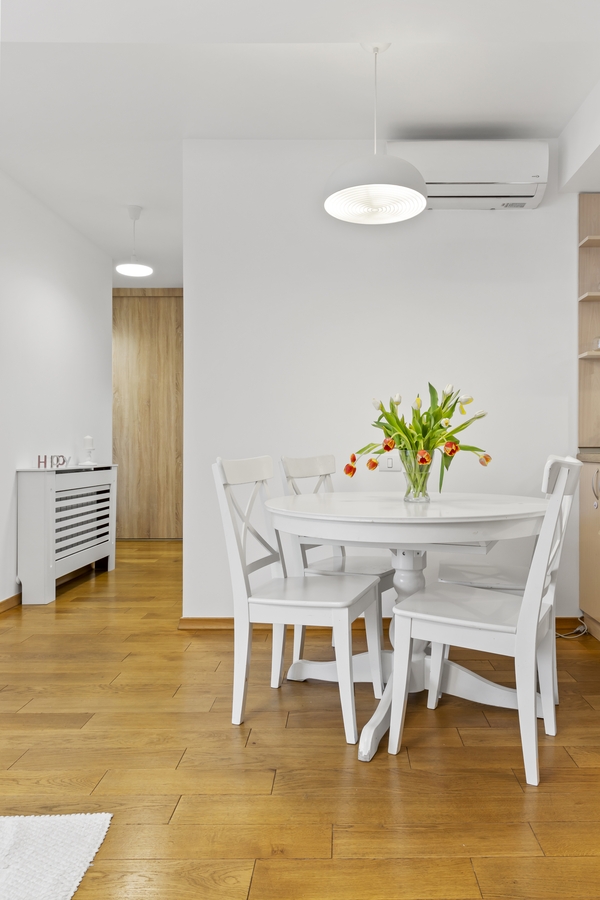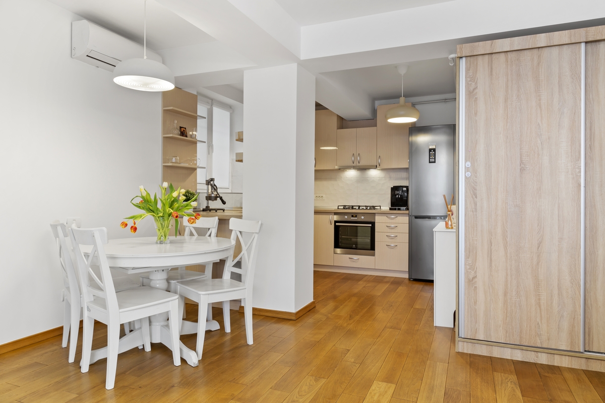 Intrare, Hol cu dresing incorporat in perete apoi Living/camera de zi cu dining/loc de luat masa si bucatarie open-space.