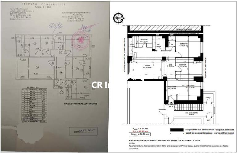 Apartament 4 camere transformat in 3 camere si dressing ( situatia actuala- releveu) se poate reface conform situatiei initiale,sunt trase tevi pentru posibila montare a centralei,