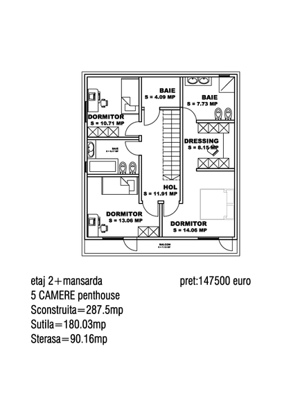 Penthouse 5 camere in vila, regim de inatime P+2+M, scara interioara, mobilat, utilat, boxe depozitare la subsol 9mp, loc parcare acoperit 15 mp, terasa cu vedere la padure.
