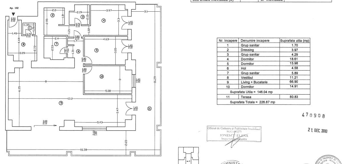 Apartament 4 camere la etajul 1, situat intr-un ansamblu rezidential exclusivist, parcare acoperita, cu apartamente de lux de 3, 4 si 5 camere, cu finisaje si dotari moderne de cea mai buna calitate, avand o suprafata construita de 226,87 mp si utila de 146.04 mp. In cadrul complexului gasiti multe restaurante : Bacania Veche, StarBucks, SubWay, Gregorys, GuriGuri (Korean), Salad Box, Fresh Time, sala de fitness, aerobic si piscina interioara: World Class; Supermarket: Mega-Image, Curatatorie Croitorie Azur, Saloane: Geta Voinea, Banci: Banca Romaneasca, Bancpost, Marfin Bank; BRD, Farmacie: Sensiblu, Clinici: Medicover, Altele: Pepco.