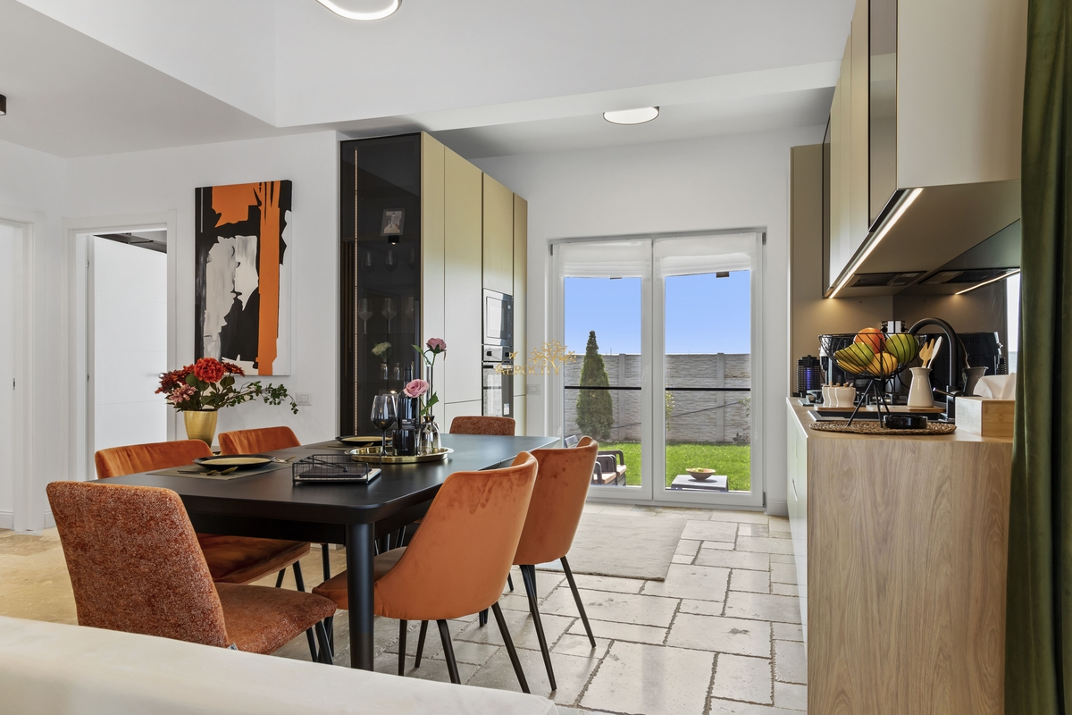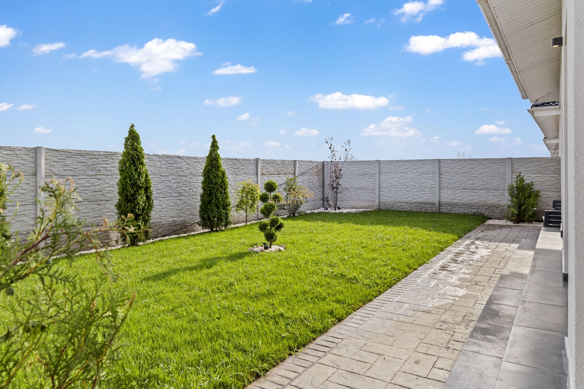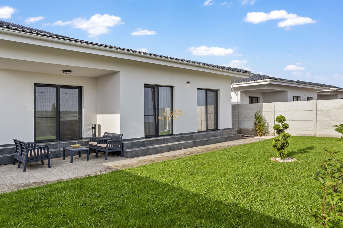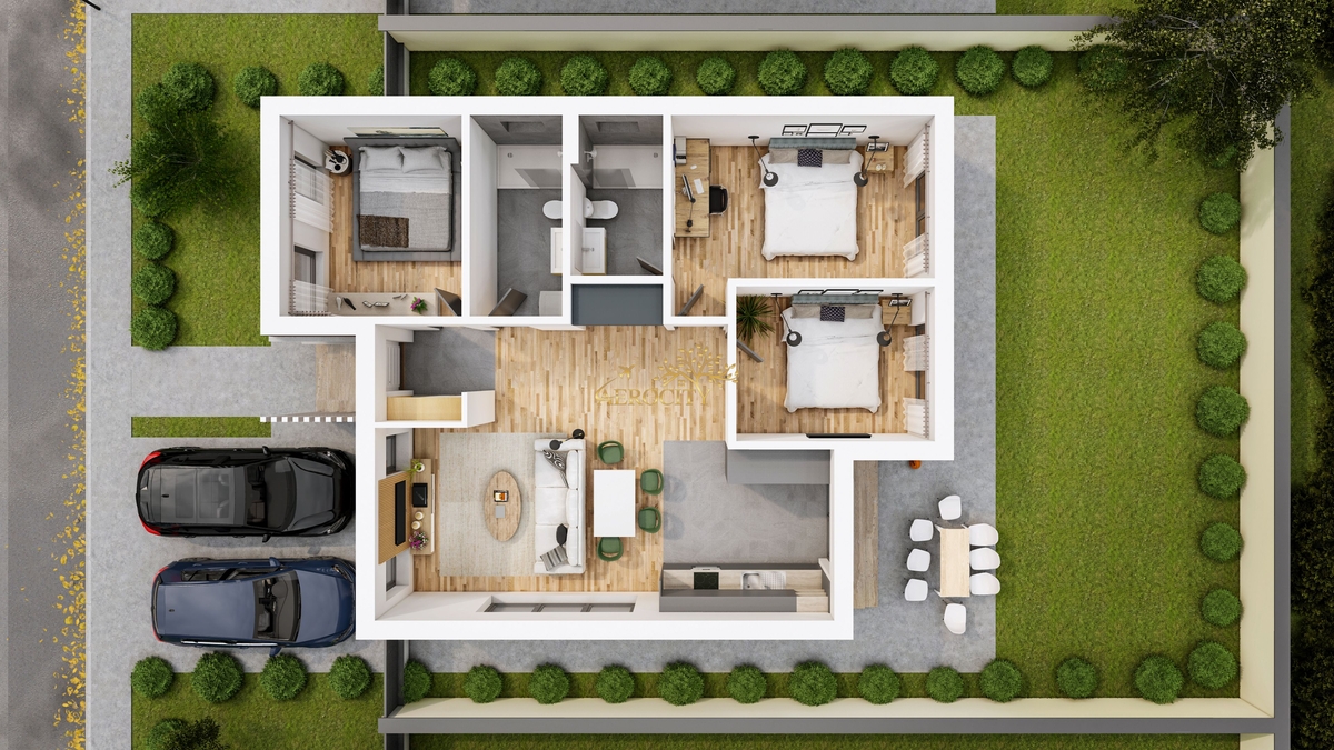 Bucataria este asezata strategic in zona livingului avand acces pe terasa amenajata la nivelul solului: 20 mp. Doua dintre dormitoare au acces catre curte.