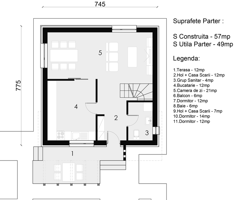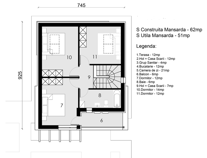 Optiuni interior: 2+ gr. sanitare Alimentare apa Centrala termica Fosa septica Gaze Izolatie termica Living Mansarda Terasa