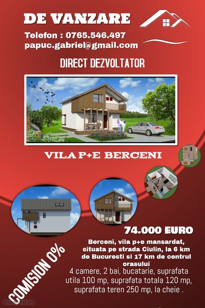 casa p+e mansardat, situata in Comuna Berceni, strada Ciulin, la 6 km de Bucuresti si 17 km de centru, constructie 2017, suprafata construita 120 mp, suprafata utila 100 mp, teren total 350 mp,