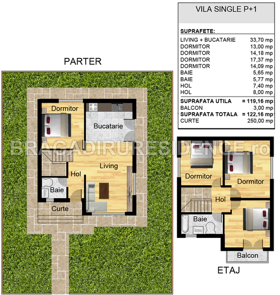Parter: hol, living, bucatarie, baie, dormitor.