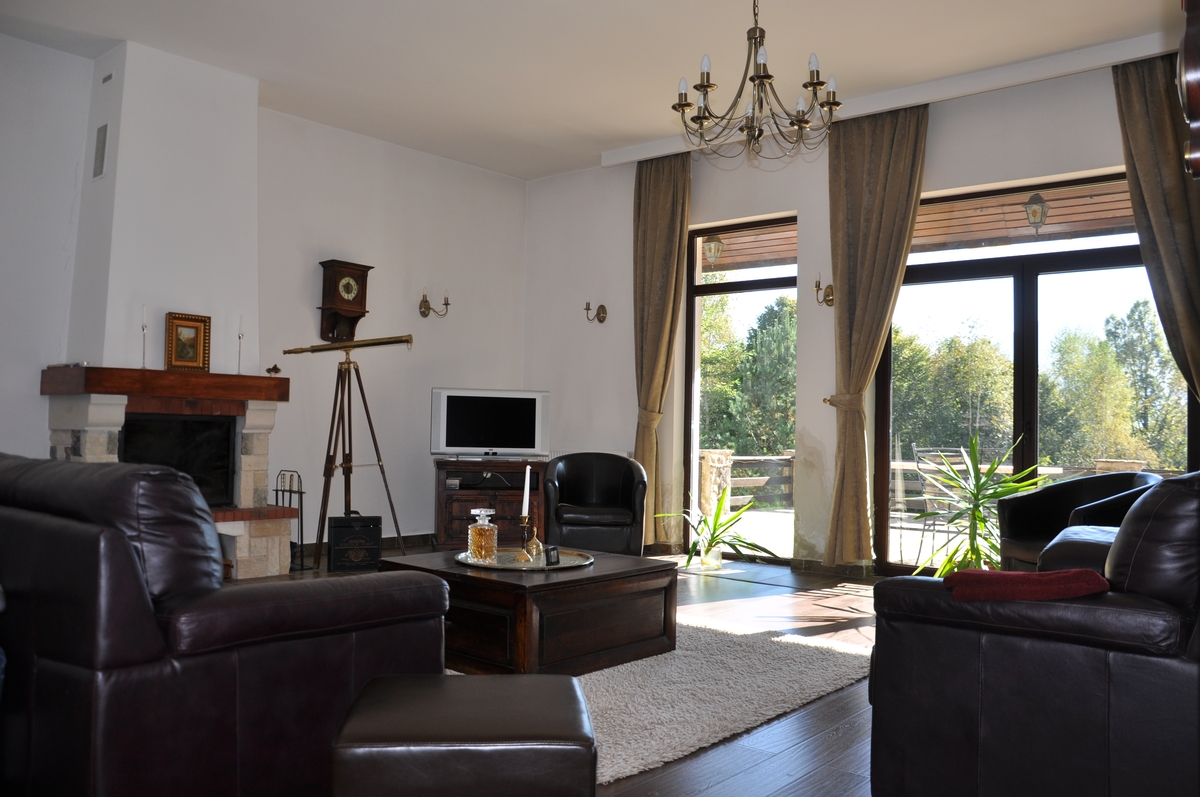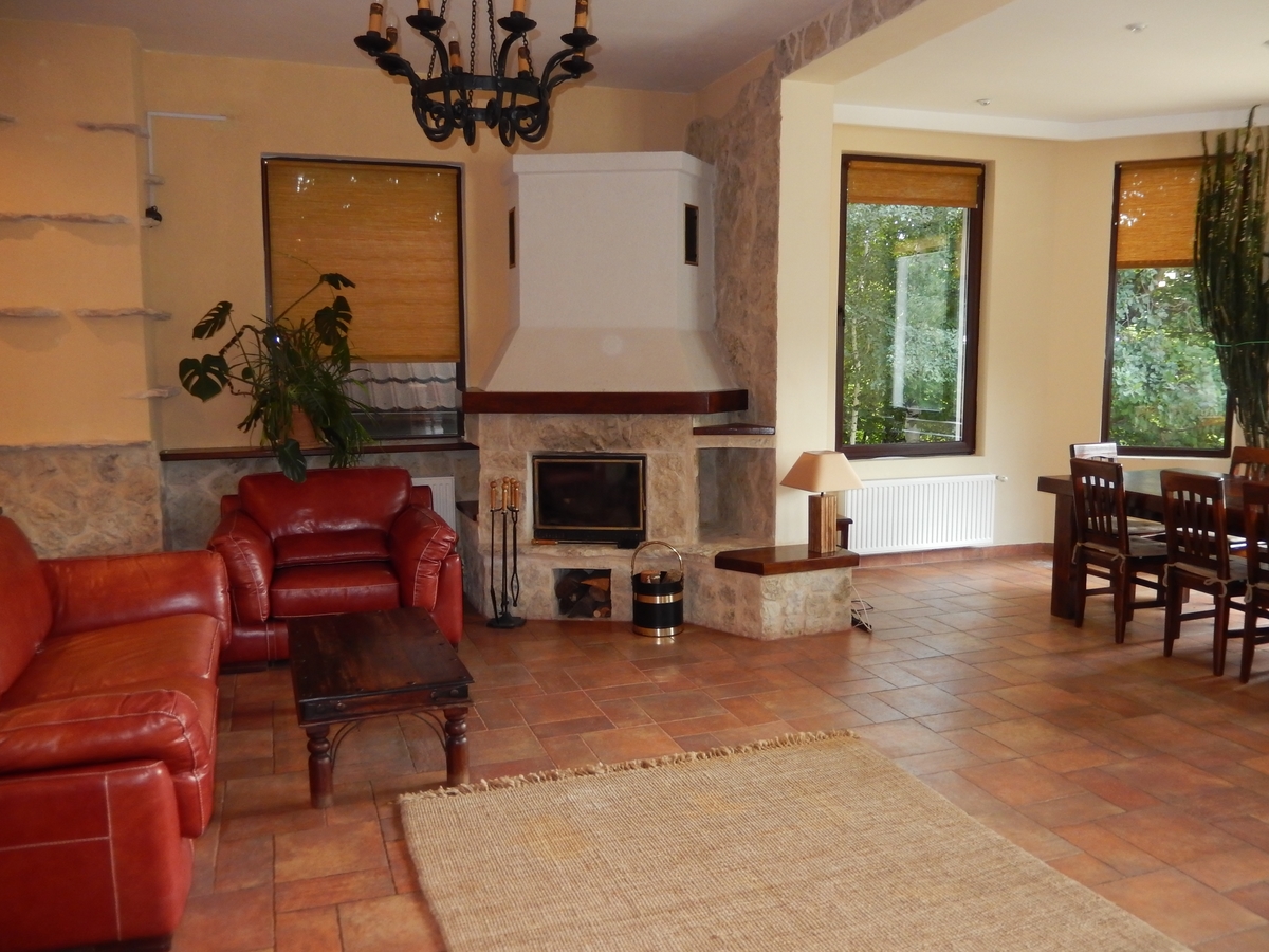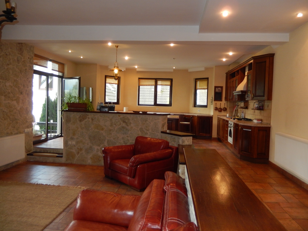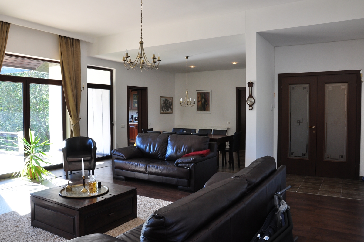 Zona de living este amenajata distinct, zona de gatit, cu bucataria deschisa, mobilata si utilata complet, cu blat de lucru/servit masa pe mijlocul ei dar si cu blat cu vedere la geam. Zona de zi are semineu pe lemne, fiind mobilata si utilata cu fotolii si canapele de piele. In living exista o veranda, acum fiind amenajata ca loc de servit masa, mobilata cu masa si scaune. Iesirea din living si bucatarie direct in terasa - vedere splendida spre Muntii Bucegi. In zilele senine se vede frumusetea muntilor, aerul fiind foarte curat. Pomii ce strajuiesc proprietatea dau un plus de ozon si intimitate. Aici ai posibilitatea de a da frau liber imaginatiei, ajutat de realitatea cu totul deosebita. Linistea te invaluie la tot pasul. Poti gasi fara prea mare efort libertatea mintii, a spiritului, ajutat de mediul inconjurator, extrem de pur.