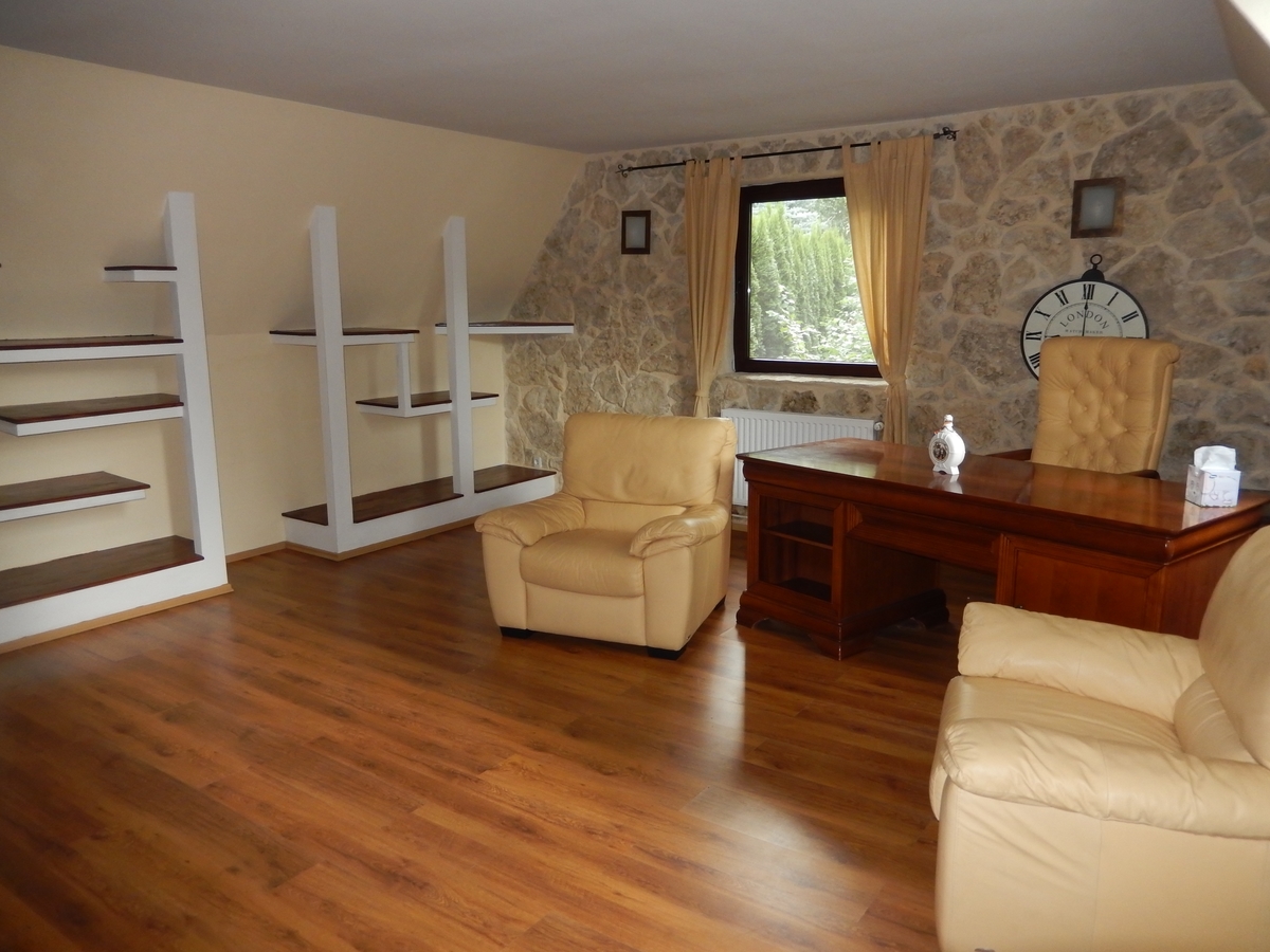 La parter este un living cu loc de luat masa si bucatarie cu blat de lucru - open space de 67,45 mp, o veranda de 18,75 mp, un birou de 15,60 mp, un grup sanitar de serviciu de 2,80 mp, o terasa de 16 mp - cu iesire din bucatarie si garajul dublu, cu poarta electrica de 33,30 mp - cu acces direct din casa. Din terasa mentionata se iese in alta terasa super spatioasa, de 50-60 mp - amenajata, cu balustrada de siguranta - priveliste spre munte.