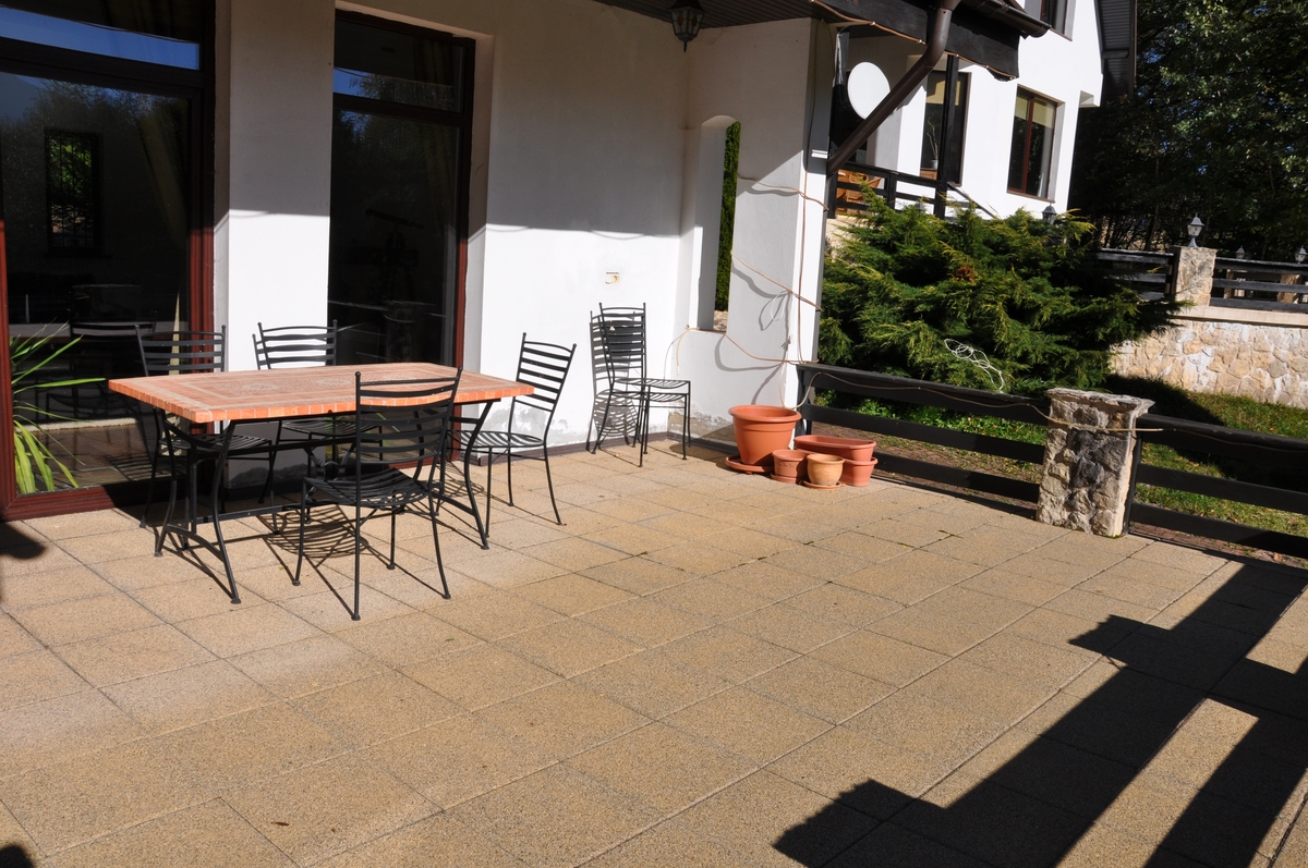 Terasa cu iesire din living este acoperita cu piatra speciala pentru exterior, fiind in stare foarte buna. Casa este in culori calde, mobilierul, gama de lux de la Mobexpert (poate) ramane integral in vila, fara sa afecteze pretul. Termopanele sunt de buna calitate, iarna facand fata cu brio la sezonul frig/geros. Sistemul de incalzire este bine gandit, la nevoie pot fi folosite amandoua centralele, desi acest lucru nu a fost necesar pana acum.