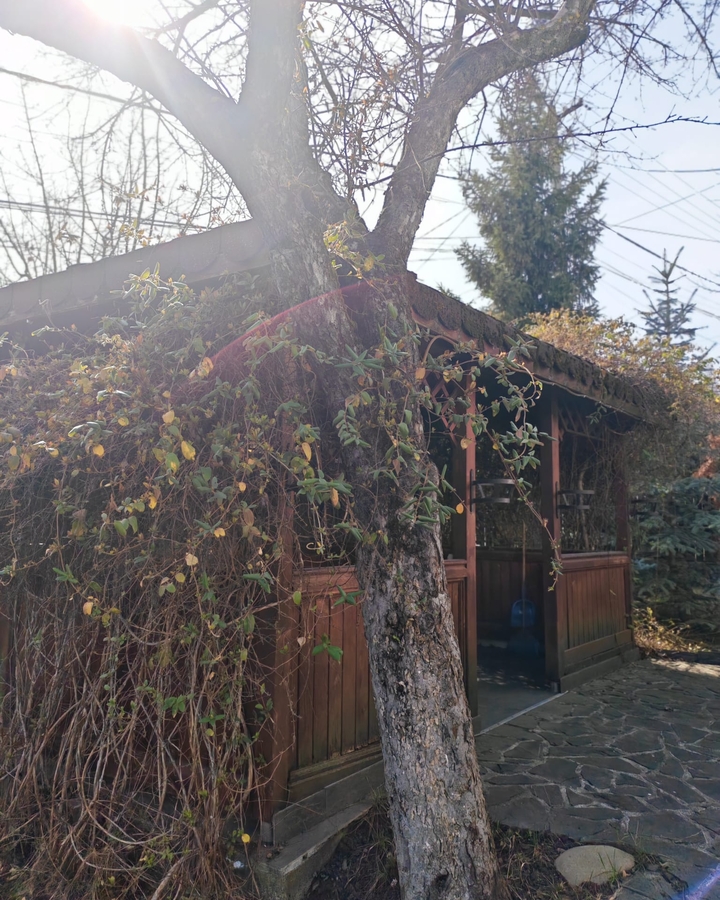 Curte: foisor, pavaj de piatra naturala- frumos amenajata.