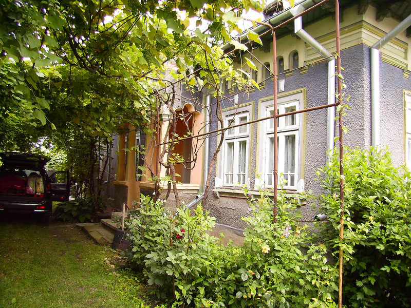 Drumul este asfaltat. Trandafiri, flori, boltă cu viță de vie.