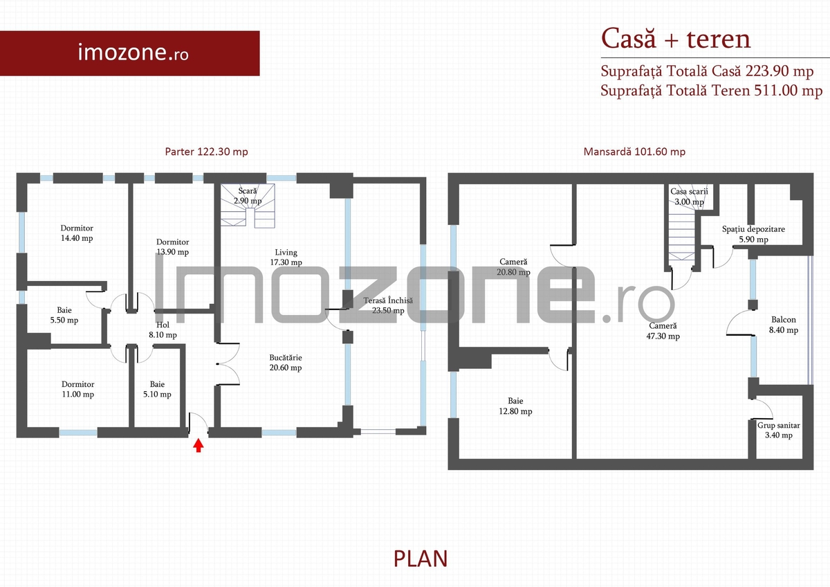 Suprafata totala de teren este de 511mp din care amprenta casei este de 120mp, spatiu pentru 2 locuri de parcare - in curte plus garajul, curtea fiind amenajata cu pavaje si beton amprentat.