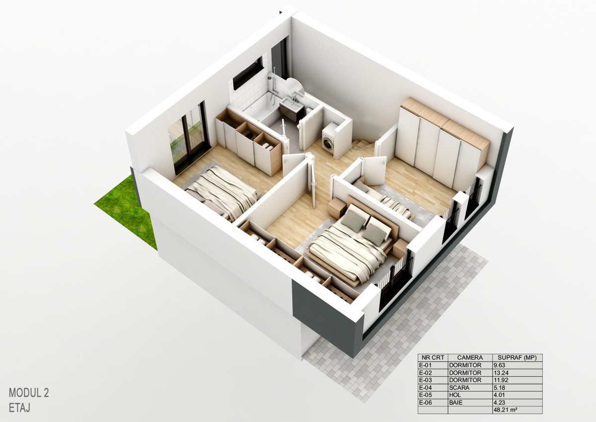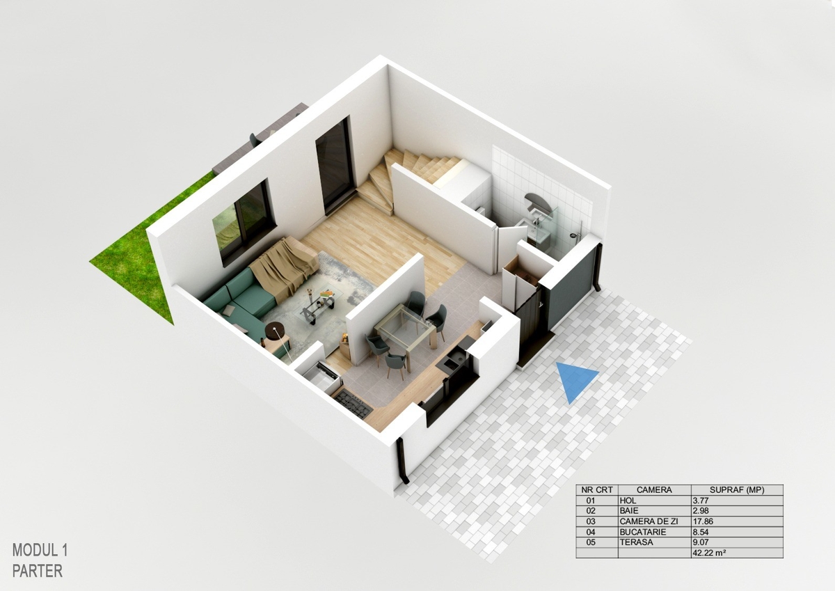 Vila are aproximativ 100 mp utili, curte proprie de 30 mp si 1 loc de parcare propiu in fata casei.