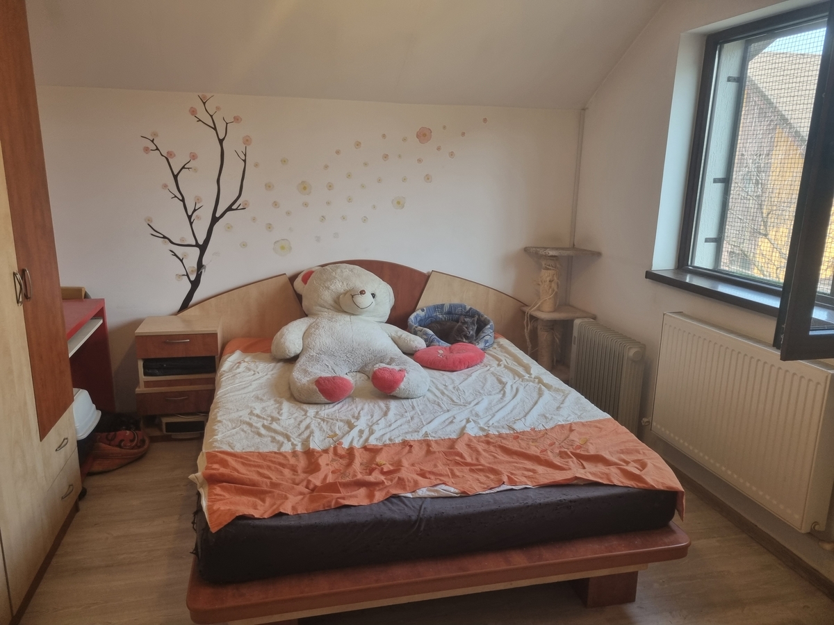 Dormitorul matrimonial se afla la etaj, fiind prevazut cu balcon.