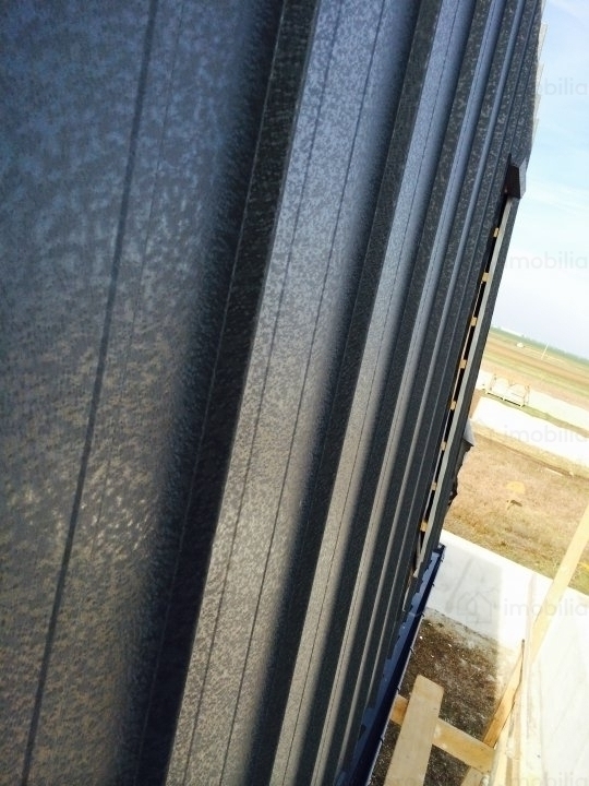 Tamplarie Rehau 5 camere, gri petrol. Invelitoare din tabla plana faltuita Thyssen Krupp Germania cu garantie 30 ani, efect Ice Crystal, grosime 0,6 mm. Pardoselile sunt izolate cu 5 cm de polistiren extrudat, peretii cu polistiren expandat EPS80 de 10 cm, iar acoperisul cu 30 cm vata minerala si folie de aluminiu.