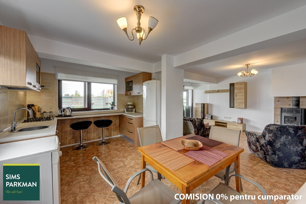 Casa tip duplex organizata pe 3 niveluri P+E+M, are o suprafata defasurata generoasa, cu spatii ample si deschise la parter in zona de zi si o compartimenare functionala unde livigul comunica cu bucataria prin locul de luat masa, o locuinta adecvata pentru familie. In living gasim si un semineu, pentru un plus de caldura sau o atmosfera placuta in zilele de iarna. Pentru aspect armonios, unitar, placarea ceramica este montata peste tot de la intrare, in living pana in bucataria complet mobilata si echipata cu spatii numeroase de depozitare.