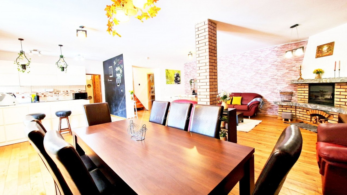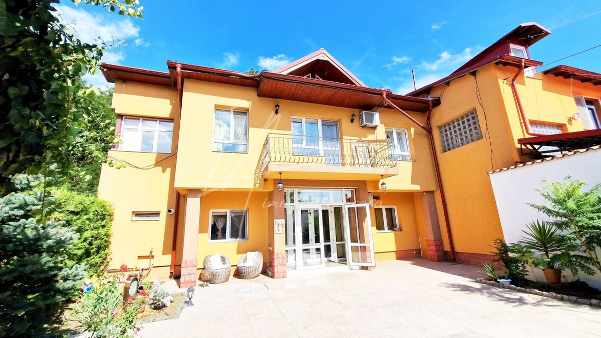 Casa principala amplasata cu spatele catre strada si este amenajata intr-o maniera calda si primitoare, avand la parter un living imens cu semineu, deschis cu bucataria eleganta si un grup sanitar iar la etaj un hol locuibil amenajat ca spatiu de birou, dormitorul matrimonial cu dressing si baie proprie cu vedere catre piscina, alte doua dormitoare si o baie amplasata pe hol. Podul mansardabil poate fi o varianta de extindere a spatiului locuibil, in caz de necesitate.