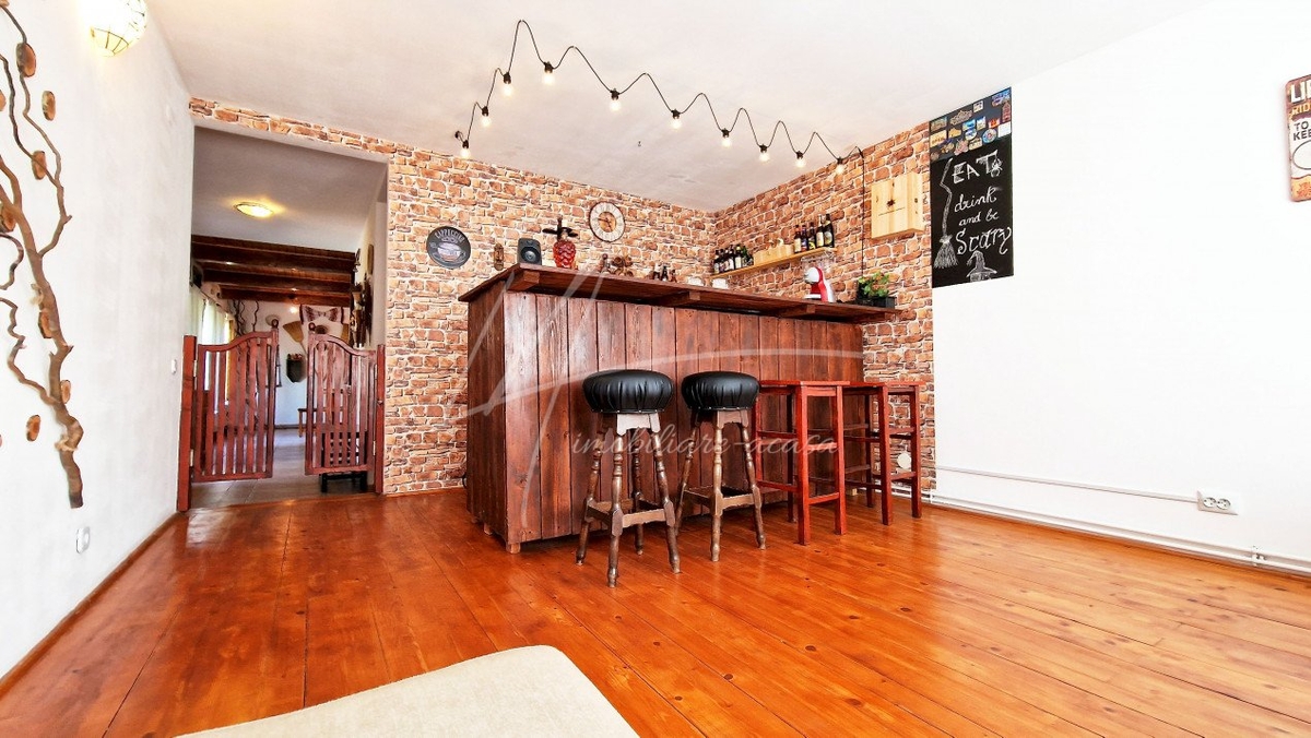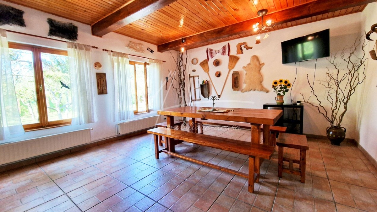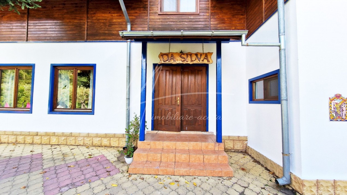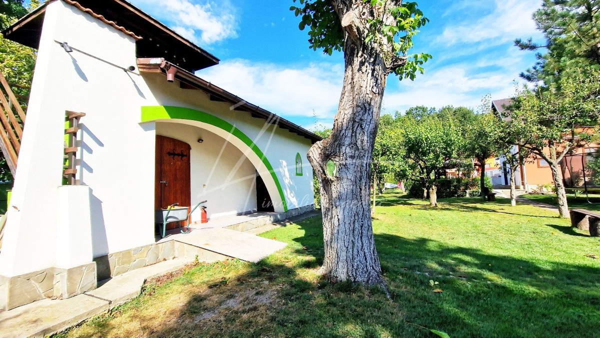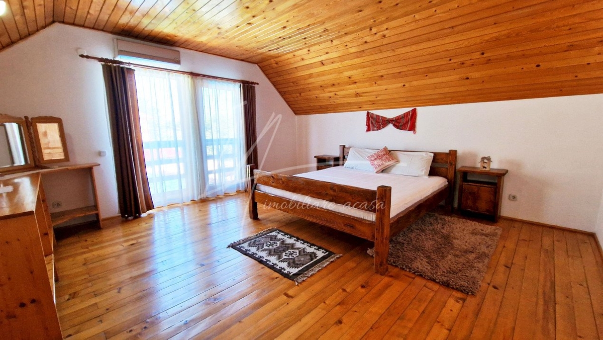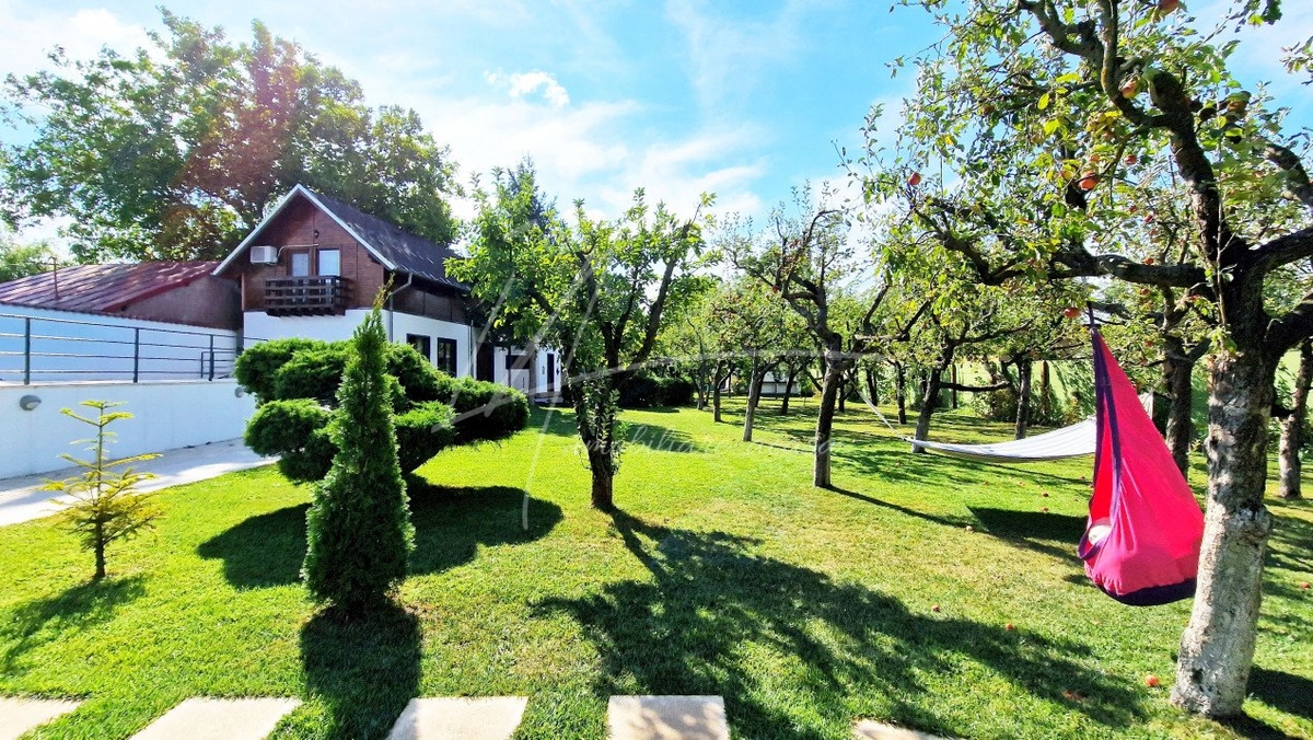 Casa de oaspeti situata langa piscina, a fost construita pe structura de lemn si fundatie de beton este impartita la fel de eficient ca si constructia principala. Un beci incapator, living cu bucatarie deschisa, baie si camera-bar la parter, hol larg din care se face accesul in cea de-a doua baie si in cele 3 dormitoare, la etaj.