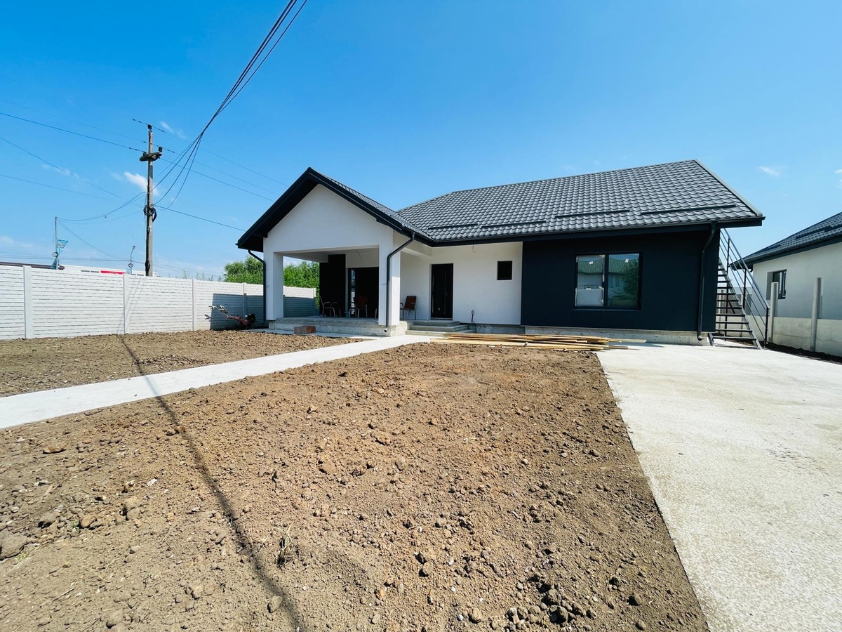 Curtea se preda fara gazon, doar cu alei betonate. Scara exterioara pentru acces in pod, geamuri Velux, bransamente pana in mansarda pentru apa calda / rece / curent si canalizare / tevi incalzire / irigatii + gazon / foraj apa - se pot face contracost.