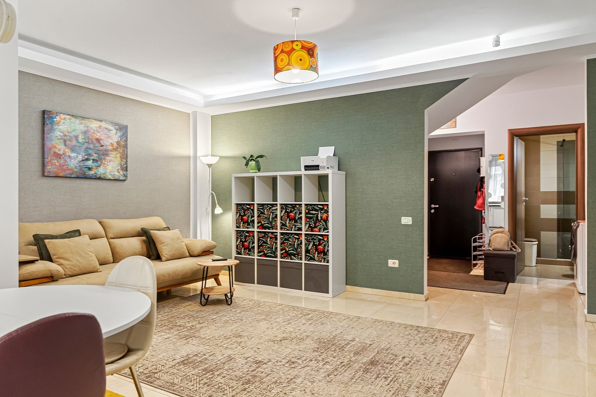 • Livingul are suprafata de 23 mp, (34.7 mp impreuna cu bucataria) cu acces spre pe terasa si gradina amenajata. Este complet mobilat cu canapea extensibila, mobilier de living cu TV (Samsung cu diagonala de 138 cm) incorporat si corpuri de iluminat moderne inclusiv lumina ambientala.
