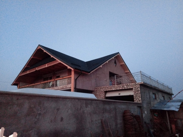 Bucatarie cu terasa. Casa e acoperita cu tigla metalica.