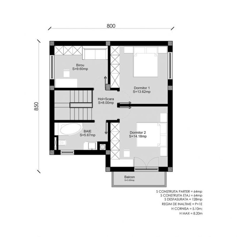 Vila este P+1, compusa din living, 3 dormitoare, 3 bai, bucatarie, terasa, balcon, cu o suprafata utila de 135 mp.