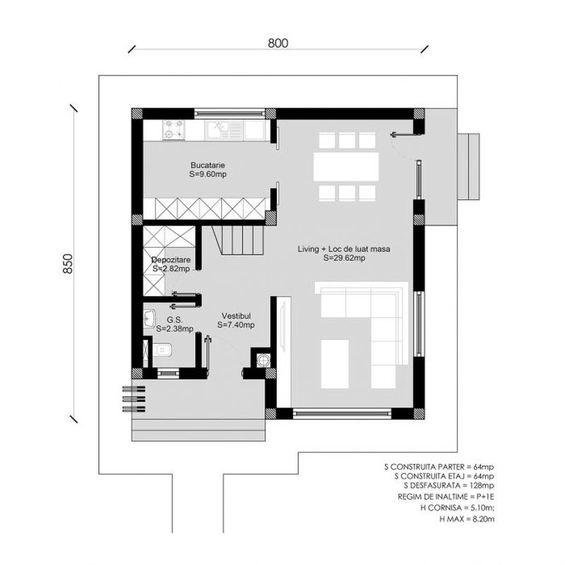 Suprafata construita este de 175 mp, iar terenul de 350 mp.