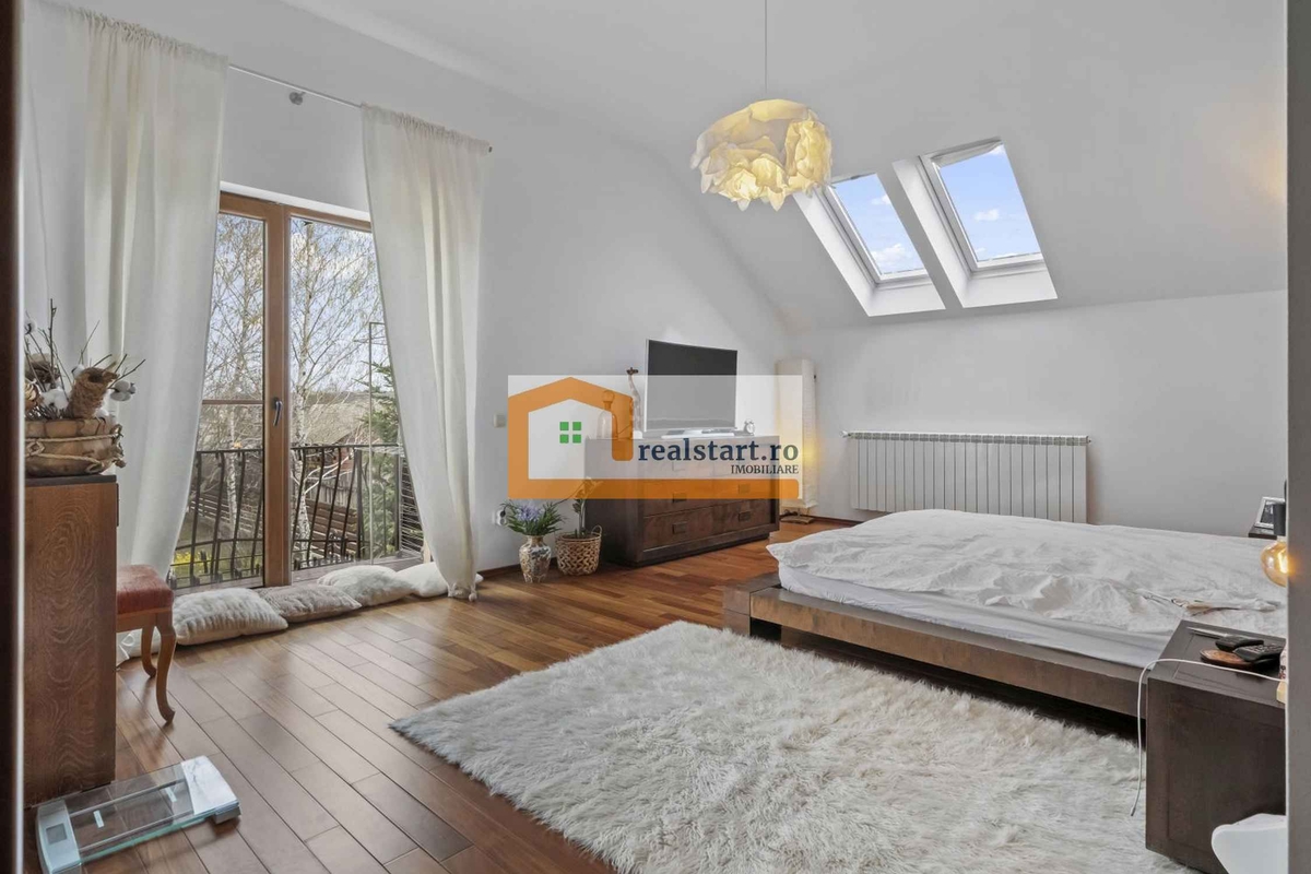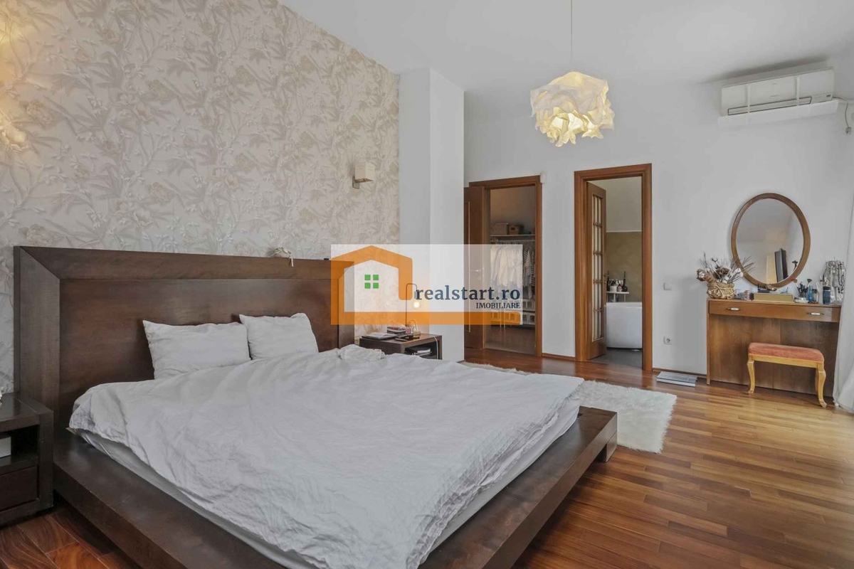 Interiorul imbina armonios eleganta stilului clasic cu accente nordice moderne, rezultand un ambient cald si rafinat. Mobilierul din lemn masiv, parchetul natural si elementele din fier forjat sunt completate de corpuri de iluminat si detalii de décor atent alese, care creeaza o atmosfera echilibrata si primitoare. Livingul este luminos si aerisit, definit de suprafete vitrate ample ce ofera o priveliste placuta catre terasa si gradina din aproape orice unghi. Bucataria, complet mobilata si utilata, comunica elegant cu zona de zi prin usi din lemn masiv tip glasvand, pastrand in acelasi timp functionalitatea si intimitatea spatiului.