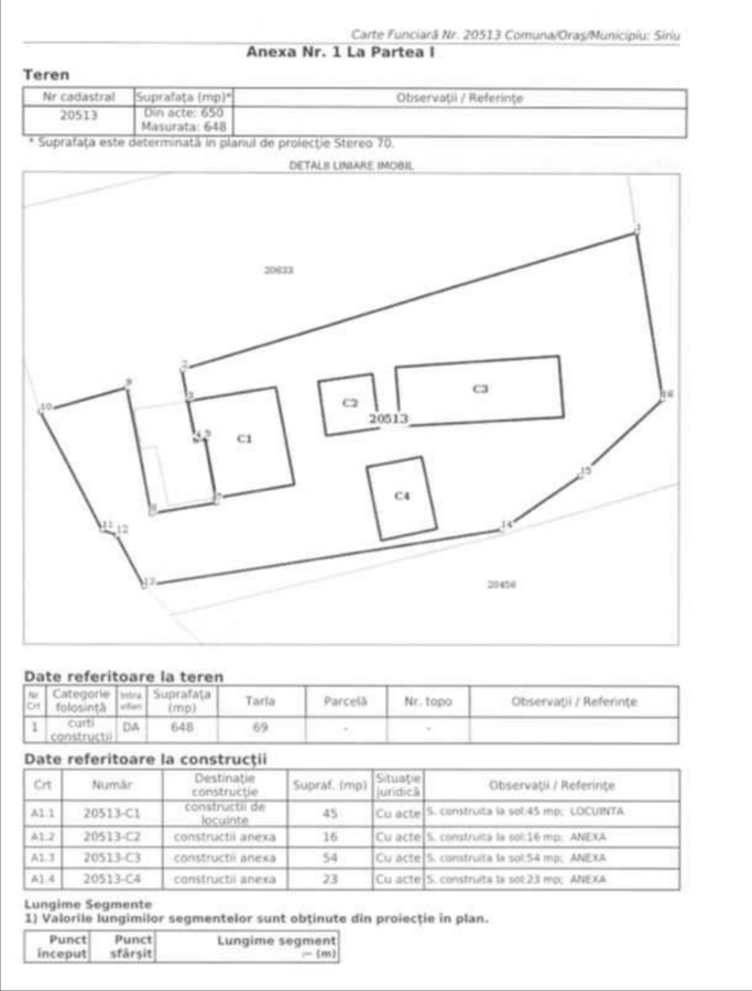 Terenul are suprafata de 648 mp si casa cu toate anexele au in total aproximativ 120 mp.