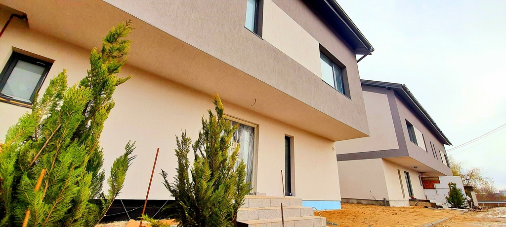 Izolatie exterioara cu polisteren de 10cm iar podul va fii izolat cu vata de 20cm, usa intrare metalica marca Traiana, tamplarie termopan tip Salamander tripan cu 7 camere, gri antracit.