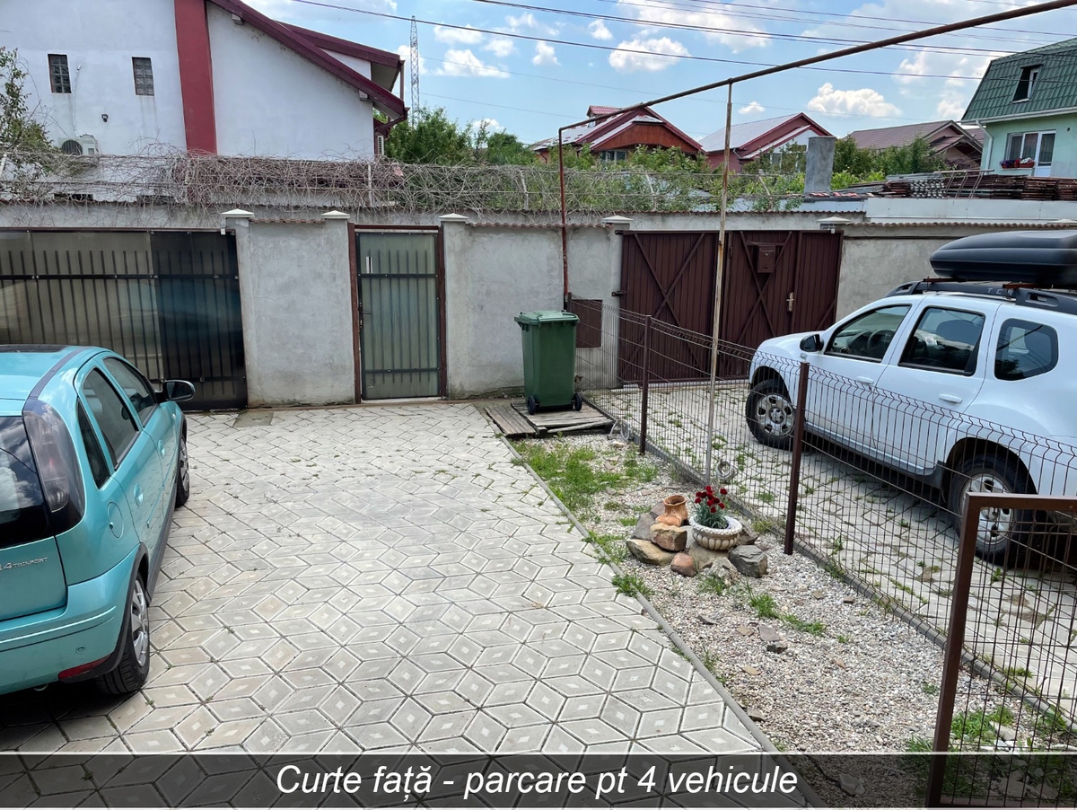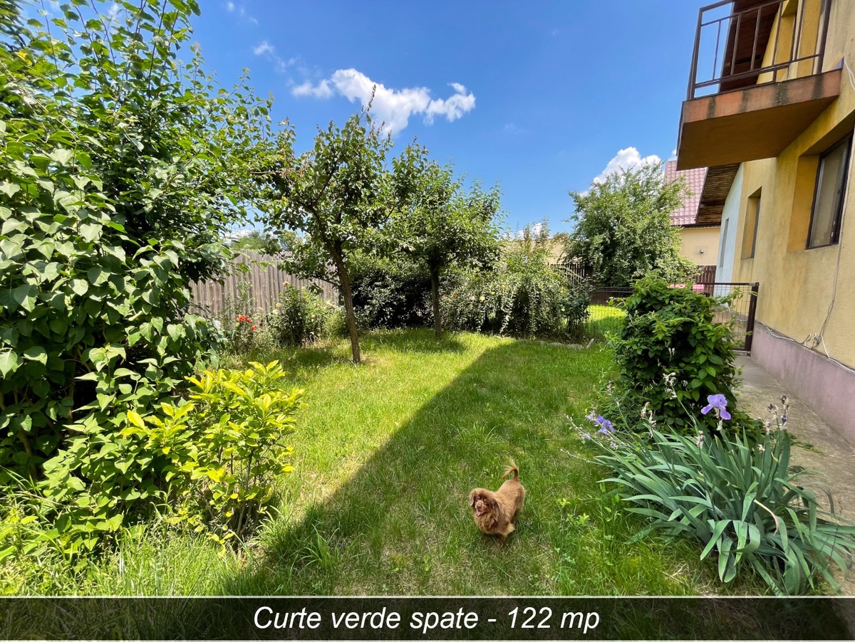 Curtea este amenajata in doua zone: in fata pavaj pentru parcare auto si terasa acoperita, iar in spatele casei pe o suprafata de 122 mp zona verde (gazon + pomi fructiferi, brad, zone cu flori.