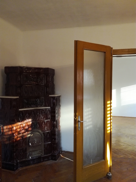 Casa: incalzire cu 3 sobe de teracota (exista traseu pentru centrala termica - anterior a fost dezafectata), boiler apa calda, camere cu inaltime de 3m, pardoseala cu parchet din lemn masiv, geamuri duble cu tamplarie din lemn si rolete, acoperis tigla (posibilitate de mansardare).