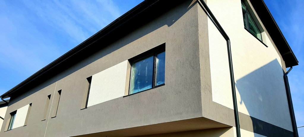 Izolatie exterioara cu polisteren de 10cm iar podul va fii izolat cu vata de 20cm, usa intrare metalica marca Traiana, tamplarie termopan tip Salamander tripan cu 7 camere, gri antracit.