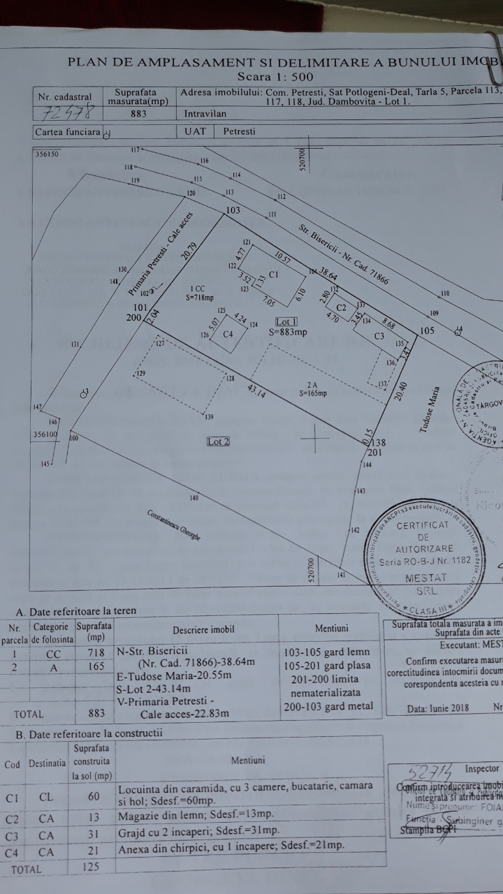 Vand casa cu teren in suprafata de 883m. Casa are trei camere si doua incaperi pentru depozitare. Aceasta este acoperita cu tigla, construita din caramida in anul 1976 si finisata exterior in detaliu cu lavabila si ornamente florale. In fata casei este o alta constructie alcatuita dintr-o camera plus inca una alaturata mica(camara) Constructia poate fi folosita pe post de Bucatarie deoarece este incalzita cu soba cu plita. In gospodarie se mai gaseste si o Bucatarie de vara construita in anul 2018 din OSB pe postament de ciment. Toate aceste constructii se afla in curtea principala, totodata aceasta fiind cimentata. In partea din spate, secundara a curtii se gasesc: o magazie din lemn cu porumbar, doua alte incaperi anexe cu fanar deasupra si cocina din beton. Gospodaria dispune si de o gradinita cu flori: respectiv in fata casei, si de o gradina de legume, respectiv in lateral cu un solar cu dimensiuni de 4x10 pe structura de lemn instalat in 2019. Curtea dispune de apa curenta si fantana potabila. Casa este pozitionata intr-o zona linistita avand in fata casei un parc de joaca frumos amenajat pentru copii. Locatia este jud. Dambovita, comuna Petresti, sat. Potlogeni Deal, str. Bisericii, nr.6. Locatia este la aproximativ 78 km de Bucuresti, 40 km de Pitesti si 10 km de Gaesti. Merita vazut. Pentru cei interesati, alte detalii si poze/filmari cu interiorul casei etc contactati-ma la nr. de telefon pe whatsapp 0731247769.
