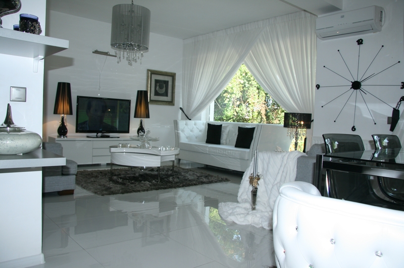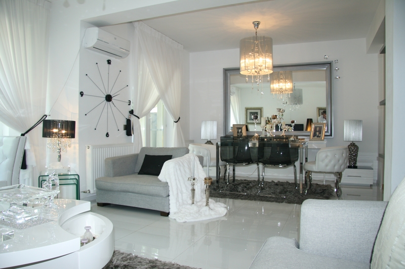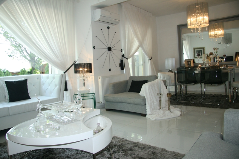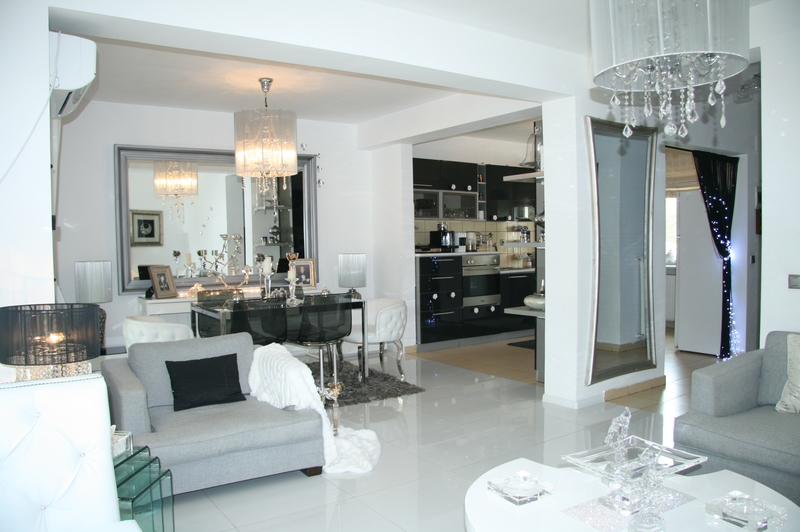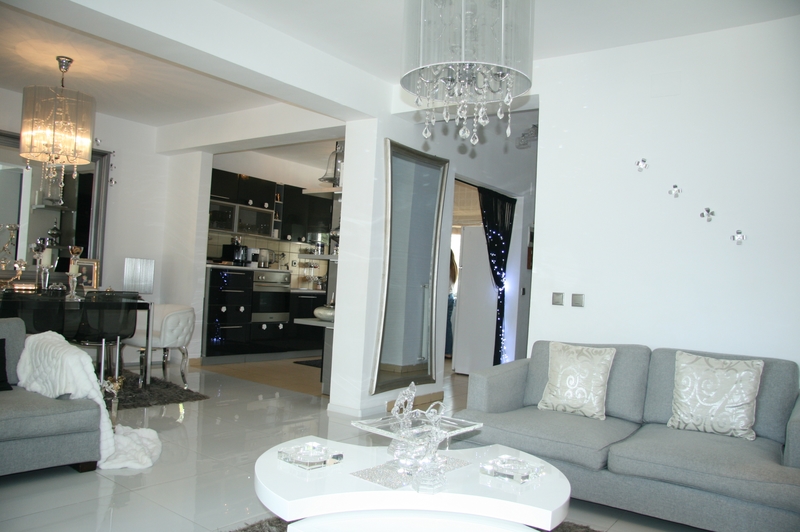 Holul de la intrare, living-ul si bucataria sunt pardosite cu marmura alba de foarte buna calitate, in toate camerele cu parchet, baile cu gresie si faianta Marazzi; corpuri sanitare si mobilier de baie – Laufen, Jika, Riho (Germania, Cehia), dotate cu baterii Grohe (Germania), toate usile din interior marca Pinum Doors si ferestrele din PVC cu geam termopan