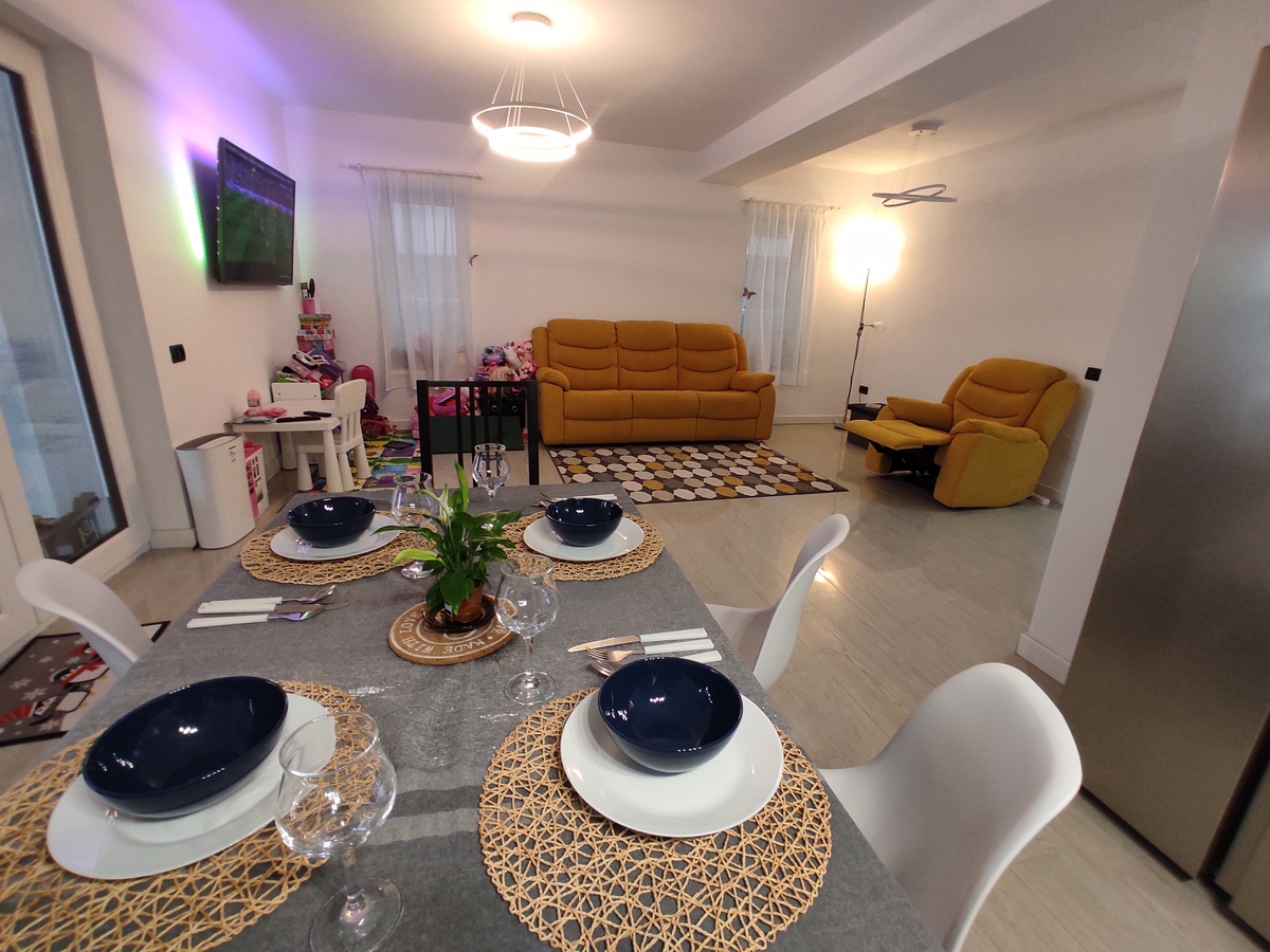 - bucatarie MDF complet mobilata si utilata (frigider side-by-side, cuptor, plita inductie, masina de spalat vase, hota tripla de mare putere de evacuare);