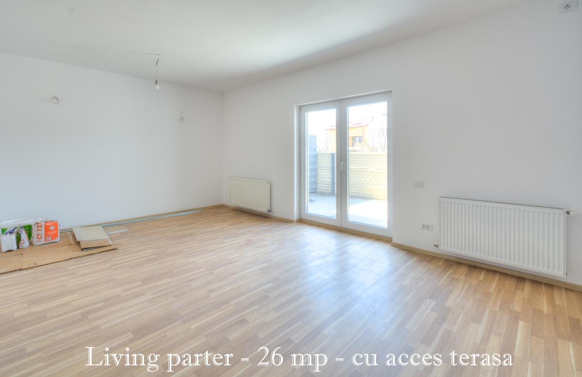Parter: living: 26 m2, bucatarie inchisa: 11m2, baie: 4,8m2, spatiu de depozitare: 3m2, hol.